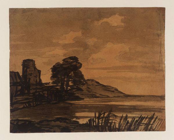 Curator: This is "A Ruined Building" by Alexander Cozens, created sometime in the 18th century. What strikes you initially? Editor: Bleak beauty. It’s a melancholic scene, all browns and grays. The ruined structure almost seems to merge with the landscape. Curator: Ruins often symbolized the transience of human endeavors. Cozens was quite interested in how landscapes could evoke emotional responses. Editor: Definitely evokes a somber mood. The dead tree adds to that feeling of decay, almost like a visual memento mori. Curator: The tree, silhouetted against the sky, does suggest a certain starkness and perhaps a reflection on mortality. Editor: I feel like I am seeing beyond the literal depiction of this landscape. It could be a comment on ambition, time, even memory. Curator: Absolutely. Cozens masterfully uses a simple scene to convey complex ideas about time and human existence. Editor: It’s amazing how much feeling he packed into such a small piece. A little window into a world of lost grandeur.