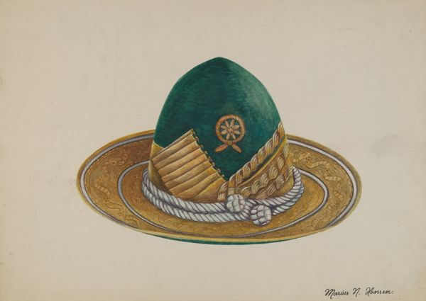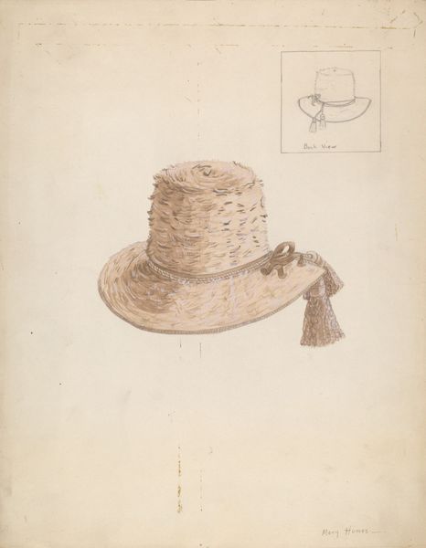 Editor: This watercolor drawing, "Spanish Southwest: Hat," was created around 1939 by Harry Mann Waddell. It’s just a simple hat, but there is a quiet, unassuming dignity to it. What do you see in this piece? Curator: I see more than just a hat; I see a symbol of cultural identity and resilience. The imperfections – the holes, the wear – speak to the lived experience of the people who wore such hats. Consider it as an icon representing the relationship between people and their environment. Editor: Interesting! The imperfections humanize it, almost like a portrait of a person, wouldn't you say? Curator: Precisely! The hat serves as a tangible link to a specific time and place. It evokes questions: Who wore this hat? What was their life like? What stories could it tell? The woven material itself hints at the labor and artistry involved, connecting us to traditional craft practices. Editor: So, it's not just an object, but a repository of memories and cultural heritage? Curator: Absolutely. And the artist’s choice of watercolor lends a certain softness and vulnerability to the image, perhaps reflecting a nostalgic yearning for a disappearing way of life. Consider the way such imagery might challenge prevailing narratives or stereotypes of the Southwest. What does the simplicity of the object communicate? Editor: I guess it shows that even mundane objects can carry deep meaning. Thanks, I never thought of it that way! Curator: My pleasure. Remember that every image, every symbol, has the potential to unlock a wealth of cultural memory and understanding.