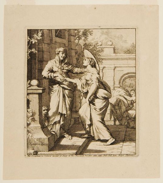 This print, "Oude vrouw slaat een jonge vrouw" (Old woman hits a young woman), was created by Cornelis Bloemaert in the 17th century. During this time, depictions of women often reinforced societal hierarchies and gender roles. Here, we see a stark display of power dynamics, played out through the bodies of women. The older woman’s posture and raised hand exude authority, while the younger woman cowers, embodying vulnerability. This image speaks to a society where age and status could dictate one's ability to exert control, even through violence. The print invites us to reflect on the emotional landscape of women’s relationships, and the ways in which societal norms can be internalized and acted out. It is through careful considerations of the complexities of gender and power, that this image continues to resonate, reminding us of the ongoing need to address inequalities and challenge oppressive structures.