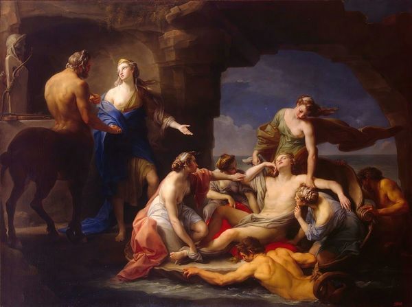 Curator: Standing before us is Jacques-Louis David's "The Death of Seneca," created in 1773. Quite a chilling subject, isn't it? Editor: Absolutely, there’s something so theatrically morbid about it. That stark lighting really emphasizes Seneca's pale skin and the stark contrast with the dark backdrop. All this theatrical drama really makes you focus on his last moments. Curator: Yes, it's staged almost like a play. David uses the neoclassical style to draw on ancient Roman ideals. But beyond the historical recreation, look at how he conveys Seneca's stoicism in the face of death. He chooses to depict Seneca almost as an actor, presenting himself admirably. Editor: Interesting. For me it is all about process: think about the materiality of this. Oil paint was expensive! Commissions of this scale, not cheap. Who paid, who profited from Seneca's demise—who got this history painted? The marble columns dwarf the figures making you contemplate material legacy as Seneca departs it. I almost forget that I am considering this painting. I get so involved in what the actual painting does for our consideration. Curator: I do like how you always bring the materiality back! I get so lost in narrative I can miss how crucial production is to perception. This really pulls me back. Even in his supposed defiance of imperial power through suicide, Seneca can't escape commodification! And Seneca’s “tranquility” really resonates when considering the economic impact of making this painting! He almost looks beatific as his arteries are being cut! What did Seneca actually look like during these final moments? Probably a lot different than this calm. So interesting what details matter the most during production, and how these amplify perceptions later. Editor: Well, precisely! Neoclassicism loved that kind of idealization—smoothing away the rough edges. The focus on stoicism masks so many potential details. What color was the wine? The political discourse swirling amongst the figures? The answers are absent. So we center around only David's intention with the tools in his reach! Curator: And David truly masterfully utilized those tools, capturing a crucial scene through his classical lens. It's a painting that definitely sparks dialogue, that's for certain. Editor: Indeed! I never would have guessed it could spur so many questions. And there is no doubt the answers lay behind all the paints.