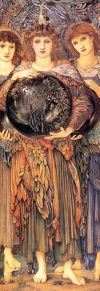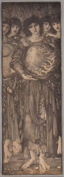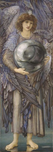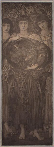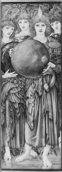 Editor: This is Edward Burne-Jones' "The Days of Creation: The Third Day," and I'm struck by the ethereal quality of the figures and the orb they hold. What do you see in this piece, formally speaking? Curator: The composition is quite deliberate. Note the verticality, the triptych-like structure with the three figures, and the subtle gradation of color. Burne-Jones uses line to create a sense of depth, though it remains largely flattened. Do you notice the careful arrangement of the drapery and the delicate rendering of the figures’ features? Editor: Yes, it’s all very controlled and precise. The colors are muted and the figures have a sort of detached beauty. I see it as a cohesive exploration of form and representation. Curator: Precisely. The artist is less concerned with narrative and more focused on the internal relationships of line, color, and form. It’s a study in aesthetic harmony, a rejection of realism in favor of idealized beauty. Editor: I appreciate how your insights highlight the formal elements. It shifts my focus from just the subject to the artist's choices in presenting it. Curator: Indeed, by looking closely at these formal choices, we can better understand the artist's aesthetic intentions.