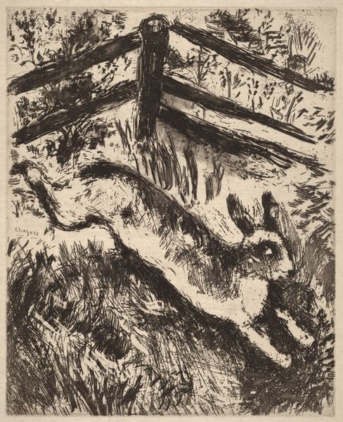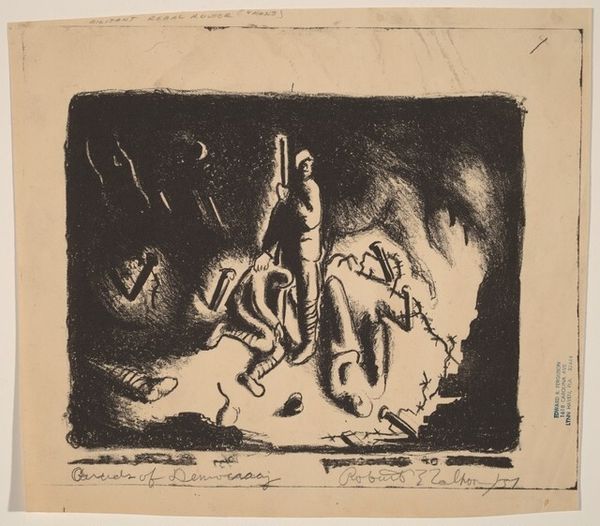 Curator: Here, we see Francis Sumner Merritt's graphite and print piece from 1942, titled "God is My Co-Pilot." Editor: It's somber, isn’t it? Dark tones, dynamic diagonals. You immediately feel the pilot’s vulnerability but also this sort of hopeful upward trajectory at the same time. The rendering suggests someone feverishly capturing an idea. Curator: That makes sense, given the period. The narrative is intriguing. A pilot surrounded by what seems like broken or abstracted airplane parts is cradled by a large cross. Editor: It's such a raw portrayal of faith amidst wartime uncertainty, I think. Like grasping for something bigger than yourself when you're literally in the thick of it, thousands of feet above the ground. The composition definitely pulls you in. It feels unfinished but also resolved—maybe like faith itself. Curator: The medium definitely adds to that rawness. Graphite lends itself to quick sketching and a sense of immediacy. It reflects the anxiety of that period as this looks to be an output intended for wide reproduction to further cement religious rhetoric surrounding soldiers at war. The textual quality in mass produced printing would provide yet another layer to this piece through its distribution as ephemera. Editor: Absolutely, there's a feeling that what's on the paper is less precious, you know? Meant to be circulated, contemplated quickly, maybe offering momentary solace or a connection to something greater while in transit. The fact it’s rendered like this actually gives the whole message more power, in my opinion. Curator: Its widespread availability meant that "God is My Co-Pilot" reached a large audience grappling with the global conflict. Understanding its initial production as a simple graphite drawing helps ground its political message, making it more easily available in a time of immense cultural need. Editor: It really encapsulates the ethos of the time, doesn't it? Looking at it now gives me that very same immediate impression. A tangible object—a drawing, a print—offering this feeling of ephemeral safety, of something watching over you. Thanks for pointing out its origins; it changed how I see the message. Curator: Likewise; seeing it through your eyes reminds me how art touches beyond historical purpose to engage universal anxieties of security during crisis.