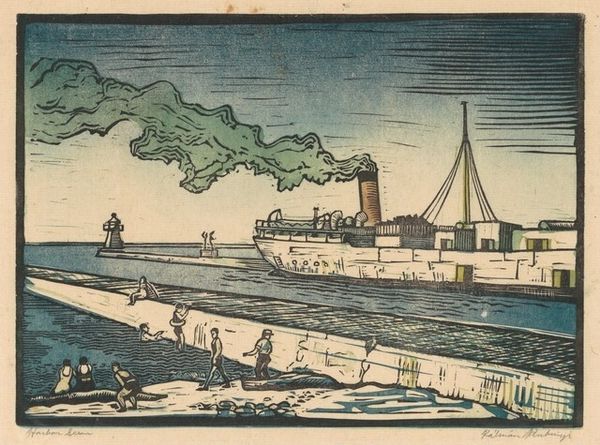 Editor: This woodblock print by Kobayashi Kiyochika, "Great Victory of Our Forces at the Battle of the Yellow Sea," shows warships on a choppy sea. The colors are muted, but the flags stand out. What symbols do you see at play here? Curator: Notice how the artist emphasizes the modernity of the warships. They represent not just military might, but also Japan’s rapid industrialization and its ambition on the world stage. What feelings do those flags evoke? Editor: Pride, maybe? Or perhaps a warning to other nations. Curator: Exactly. The artist uses these symbols to tap into powerful emotions related to national identity and the changing geopolitical landscape. This work commemorates a key victory, imbuing the scene with a sense of triumph but also the weight of responsibility. Editor: I hadn’t considered how much the ships themselves are symbols, too. Thanks for pointing that out.