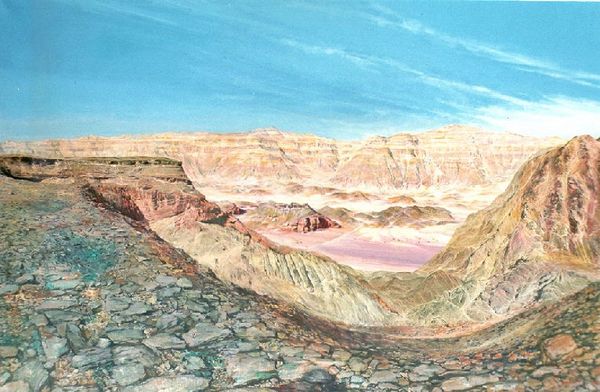 Editor: So this is “The Walls of Old England” painted by Edward John Poynter in 1914, using oil paint, supposedly en plein-air. The desolate landscape really strikes me. It almost looks like the surface of Mars! What visual echoes do you perceive in this artwork? Curator: Immediately, I'm drawn to the geological symbols – the stratified rocks, the implied history etched into the landscape itself. Poynter, likely intentionally, is not simply depicting a location, but is rather invoking a cultural memory of resilience and permanence through these imposing forms. Notice how the sky, while present, feels secondary? Editor: That makes sense. It really puts the focus on the land. Is that a romantic idea, this enduring England represented by the landscape? Curator: Precisely! The romantic impulse saw nature as a carrier of deep meaning, of national identity. What specific details strike you as evocative, symbolically potent? Editor: The small pools of water down front – they seem almost like tears in the landscape, reflecting the sky but also highlighting the aridity around them. Maybe even signifying something like loss, or nostalgia? Curator: A potent reading! Water, after all, often signifies emotion, the unconscious. Their placement could speak to a collective emotional memory tied to this "old England," one tinged with reflection on what was, what is, and what may be lost. It’s not just land; it's a palimpsest of experiences, layer upon layer. Editor: So, Poynter's landscape is more than just a scene; it’s a carefully constructed symbol? Curator: Indeed. He uses the visual language of landscape to express ideas about national identity and enduring memory. Think of it as England’s geological and cultural DNA coded into a visual space. Editor: It's amazing how much can be packed into what seems like a simple landscape painting. Curator: Precisely! Now, how might our understanding shift if we knew more about the specific location?
