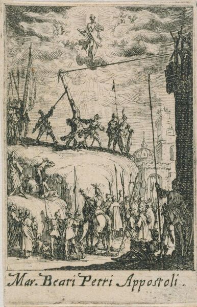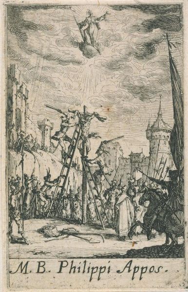 Curator: This etching, "Martyrdom of Saint Bartholomew," is by Jacques Callot. Its minute size, just 7.3 by 4.6 cm, belies the epic scene depicted. Editor: It's incredibly unsettling. The figures are so small, yet the violence feels immense. The saint's figure is being flayed, a raw and terrible image. Curator: Callot was working during a period of intense religious conflict. Representations of martyrdom were very common, used to inspire and also to warn against heresy. Editor: The symbol of the flaying knife becomes a stark reminder of faith's brutal consequences. It speaks to the power of belief and the lengths people will go. Curator: Indeed, the image emphasizes both the physical suffering and the perceived triumph of faith over earthly torment, a powerful message in Callot’s time. Editor: It makes me wonder, what did viewers at the time make of such graphic imagery? Curator: That’s a key question when thinking about the social function of art. Editor: It's fascinating how such a small work can carry such enormous symbolic weight.