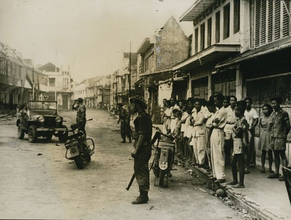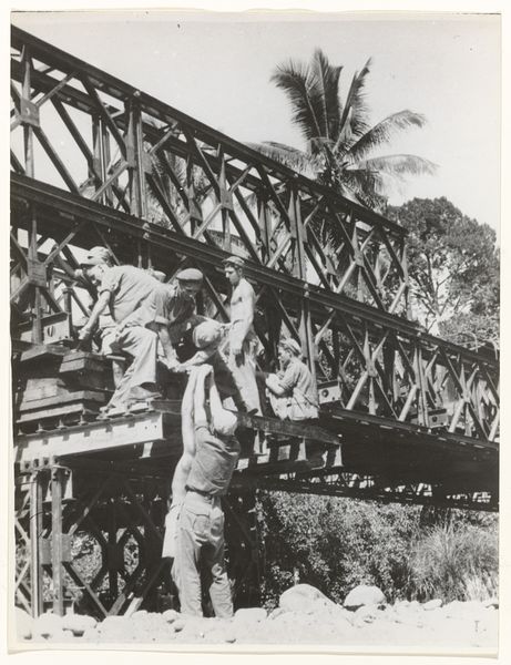 Curator: This gelatin silver print, likely from 1949, is titled "Opmars naar Solo." The photographers are credited to ANP. Immediately, the weight of it strikes me. These men, the road… it feels like exhaustion captured in grayscale. Editor: The process and its inherent limitations contribute a specific narrative layer here. Gelatin silver prints became widely accessible precisely due to industrialization. We see photographic techniques here directly linked to its period, thus its wider dissemination to a broader audience became a powerful visual tool in shaping public opinion around this conflict. Curator: Absolutely. And the choice to distribute an image like this... consider the cultural landscape, what message they wanted to convey about the Dutch efforts. I can't help but see how the staged feeling challenges traditional associations of photography. It looks posed in the midst of war, but I also recognize the intent in shaping public perception of military control. Editor: Indeed, what's fascinating to me is the raw physicality presented. These are real supplies and laboring bodies present within what are undeniably difficult terrain circumstances and situations, and the photo offers visual testimony of them all as raw elements. The men carry tangible rifles, their packs hang heavy. Curator: I agree, the reality seems somewhat manufactured, or at the very least filtered. The setting almost seems staged – the truck on the bridge, the thatched buildings, are presented to the audience like backdrops for a Western stage play. But also it allows consideration regarding what aspects about colonial operations are being showcased and also importantly, what is deliberately omitted to generate certain opinions for targeted European communities. Editor: You raise a good point there, as that kind of manufacturing and staging of events leads me towards ideas related to labor—all that it involves for those involved—that we are shown directly working within a framework created according to specific needs that in some way supports larger commercial distribution, creating a layered experience overall. Curator: Looking closer, I agree entirely. It is an important reminder how photojournalism acts both as a historical record but is also framed deliberately for public view. Editor: Absolutely. Studying how material conditions affected photography makes us see art differently than what history typically records in textbooks. Curator: Examining it this way offers vital context in terms of history and its production. Editor: It also grants greater appreciation, because seeing photography presented is quite separate from truly understanding both labor that goes behind it and what kind of material it took originally too.