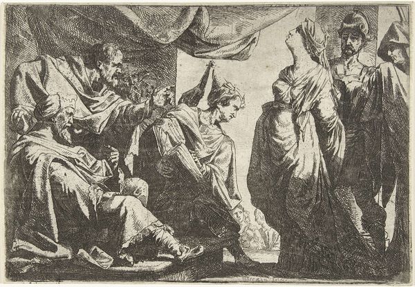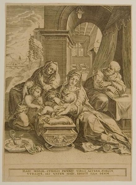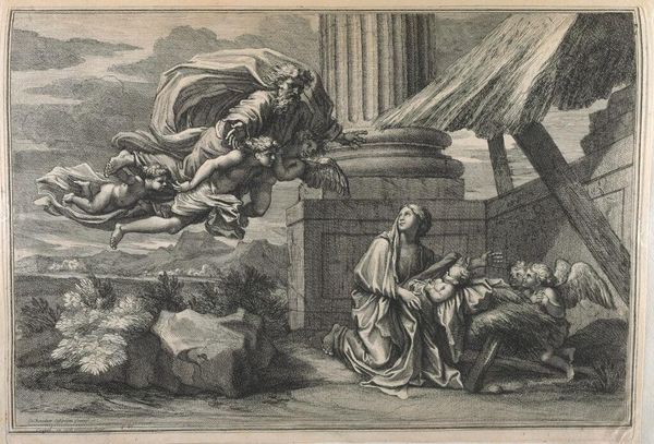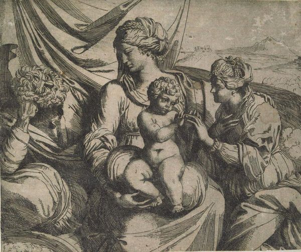 Curator: Isn't it lovely? The "Madonna and Child with a Lamb by a Low Wall," held here at the Harvard Art Museums. It's a tiny etching, just about 15 by 22 centimeters. Editor: It feels so intimate, like a stolen glance. The lamb looking up at the baby, the mother's protective hand...It's a scene of utter tenderness. Curator: The artist is, alas, unknown. We have a feeling that this was made sometime in the seventeenth century. Editor: I am curious as to why the landscape is so detailed and vast, contrasting with the sharp and flat look of the foreground wall. How do you interpret this contrast? Curator: I wonder if it suggests a sense of longing, perhaps for a simpler life, a life lived in harmony with nature... a commentary on the expectations of motherhood. The infant Jesus seems to be pointing toward a mountain in the distance. Editor: I never thought about it that way. I was stuck in the moment of that scene, you've led me to consider the painting in a new light.