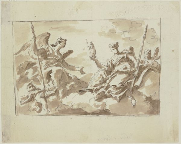 This pen and brown wash drawing, "Vision zweier Männer in einer Grotte," was created by Johann Heinrich Füssli, who was born in Switzerland and spent much of his career in London. Füssli was working during a time when artists sought to represent extreme expressions of emotion. Here, two men stand in a grotto, one partially blocking the other as they both raise their arms and look upward, seemingly stunned. What do they see? An ethereal vision of a man carrying a woman. Are they rescuing or abducting her? Füssli evokes a sense of the sublime, that overwhelming feeling of awe mixed with fear. His paintings often explored themes of the supernatural, dreams, and the darker aspects of the human psyche. Füssli lived through an era of revolution and enlightenment, he gave visual form to the complex emotions and psychological states that defined his time.