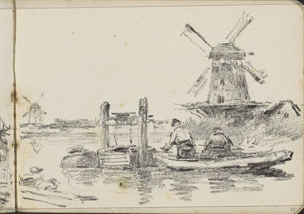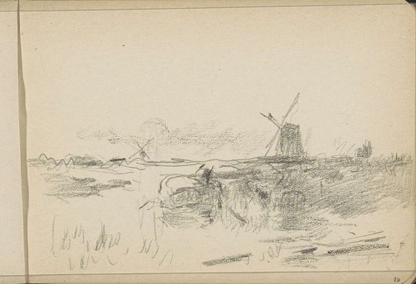 Editor: Here we have a pencil drawing titled "Windmill," by James Ensor. It's quite a study in texture and light, even though it’s rendered in such a simple medium. The windmill itself appears quite imposing and solid against a rather indistinct sky. What catches your eye when you examine it? Curator: Initially, the varied line weights dictate my reading. The artist's distinct, almost frantic, application of graphite establishes a compelling visual hierarchy. The linework around the windmill is assertive and dense, particularly when juxtaposed with the comparatively delicate treatment of the surrounding landscape. What strikes you about the spatial relationships at play? Editor: I suppose it feels a bit unbalanced. All the detail and weight are concentrated on the left side of the paper. It makes me wonder if the negative space was an intentional choice to emphasize the solidity of the structure. Curator: Indeed. Consider the windmill's architectural articulation, which appears rather precarious through his structural choices. Does the composition enhance or undermine that inherent tension for you? Editor: I hadn't thought about it that way! It feels like the windmill could topple over at any moment, yet the dense shading suggests a sense of groundedness. So, is this an intentional paradox the artist is creating using the medium? Curator: Precisely. By manipulating the properties inherent within the pencil, Ensor presents us with not just an image of a windmill, but a commentary on structure, stability, and perhaps even the ephemeral nature of existence itself. Editor: I see, so the visual language creates multiple layers of interpretation! It highlights how artistic choices surrounding line, weight, and space can be profound. Curator: Indeed. And conversely, it offers further evidence for structuralism's broader arguments about self-contained aesthetic understanding.