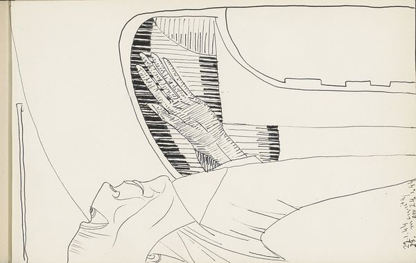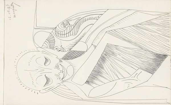 Curator: This intriguing piece, currently housed in the Rijksmuseum, is titled "Vrouw met kort haar in profiel tegen een achtergrond van gestapelde rechthoeken," or "Woman with short hair in profile against a background of stacked rectangles." It’s believed to be from 1943 and created by Samuel Jessurun de Mesquita. Editor: My first thought is its starkness. The sharp lines, the restricted palette of pen and ink, there's a sense of restrained energy. A controlled yet insistent tension within the image. Curator: It's fascinating to consider this work within the context of Mesquita's life. As a Jewish artist during World War II, he faced increasing persecution. His eventual deportation and murder at Auschwitz undeniably shadows our understanding. Does this spare style reflect the limitations imposed on his life, his artistic practice? Or can we see a quiet resistance in this choice of form? Editor: Restricting to the form; that resonates deeply here. Look at how Mesquita creates volume simply with lines. The short hair, those stacked rectangles, they aren't just backdrop – they define the woman, confine her perhaps. Is it mere suggestion or bold strokes that shape our reading here? Curator: Exactly. The profile view is telling; averted, turned away. It speaks of the constraints, the societal expectations imposed, maybe the burden she carries of grief or fear. Yet it is interesting to read this in concert with feminist thinkers, is the female subject rendered here, flattened even, by formal representation of the profile, thus lacking full agency and interiority? Editor: I read it slightly differently. The stark lines make an interesting point here. Notice the geometric forms that underpin what we see as representation: could this possibly underscore a universal quality inherent in that particular subject in this unique set of conditions? Curator: Well, this drawing serves as a potent reminder of art's capacity to encapsulate both the personal and the universal dimensions of human experience under dire situations. It urges us to look deeper, beyond the aesthetics and beyond art history. Editor: I would conclude it leaves me captivated by the elegant efficiency and it’s that distilled essence of line. A powerful statement.