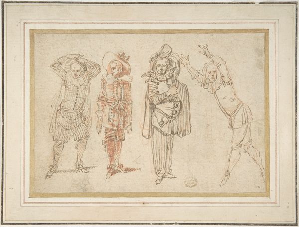 Curator: This drawing by Nicolai Abildgaard, dating from 1798 to 1801, is titled "Two Geniuses, One with an Olive Branch, the Other with Fasces." It's a pen and wash drawing, typical of his neoclassical style. Editor: My immediate reaction is one of intriguing contrast. These aren't the plump, jovial cherubs of the Renaissance. They seem quite serious, almost burdened, despite their wings. Curator: That’s a keen observation. Abildgaard was very interested in the political climate. This drawing depicts two allegorical figures: one symbolizing peace, the other authority or power. The olive branch, of course, signifies peace, while the fasces, a bundle of rods and an axe, represent Roman authority. Editor: So the fasces, usually seen as a symbol of strength and unity, seems a bit…ominous here. There’s a certain tension. He's almost hugging it. Does this drawing reflect some anxieties around authority, perhaps during the tumultuous years around the French Revolution? Curator: Absolutely. Abildgaard, though influenced by antiquity, was very much engaged with contemporary politics. The placement of these symbols suggests a precarious balance between peace and the enforcement of order, or potentially, the threat of tyranny. It encourages reflection of the role of civic duty. Editor: The figures themselves, these winged “geniuses,” are interesting too. There's something androgynous about them. Are they meant to represent specific figures, or ideals? The classical drapery almost feels like it obscures rather than reveals their forms. Curator: That ambiguity is intentional, I think. They're not portraits, but idealized figures representing concepts. In academic art, and especially within Neoclassicism, these allegorical figures serve as symbols embodying grand ideas about civilization, governance, and human potential. Editor: And yet, I can't help but read a bit of unease into their expressions. Maybe it is the stark lines of the drawing that convey that emotion. There is nothing flowy or delicate about it. Curator: It's a reminder that even in idealizing moments and figures, artists of the time still contended with the uncertainties of the world. Editor: That contrast is so strong, giving so much to discuss on something that might appear simple at first glance. Curator: Exactly. By examining Abildgaard's piece through a historical and cultural lens, and identifying its key symbolic attributes, the artwork reveals far more complex reflections of its time.