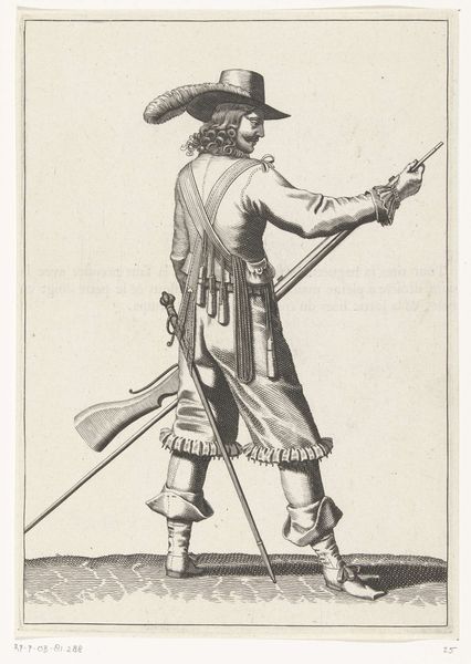 Petrus Rucholle created this etching of a soldier around 1645, amidst the Dutch Golden Age, a time of significant military and economic expansion for the Netherlands. Here we see a soldier cleaning his gun. But look closely; his fancy hat and voluminous breeches suggest that the military was a profession for the upper classes. Military service offered these men opportunities for advancement, but also reinforced existing social hierarchies, as they were also the beneficiaries of colonial expansion. What narratives of power are at play? The intimacy of the soldier's task contrasts sharply with the violence his weapon represents. What might seem like a mundane act is imbued with the weight of conflict, a reminder of the human cost of military campaigns.