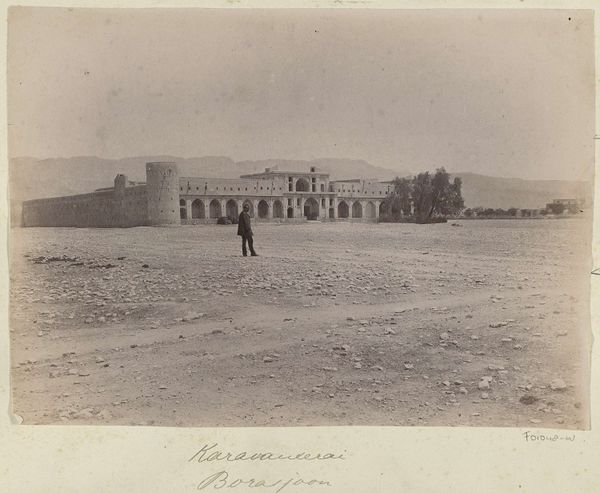 Editor: Here we have "Si-o-se Pol-brug over de Zayandeh te Isfahan", an albumen print dating from around 1880-1895, by Antoine Sevruguin. The photograph has such a unique atmosphere... it's dreamlike almost. What strikes you when you look at it? Curator: Initially, the repetition of the arches commands attention. Note the visual rhythm, how each arch, despite its individual imperfections captured by the photographic process, contributes to a larger, more unified structure. The albumen print enhances the textural contrasts. How does the subtle tonal range affect your reading of the image's depth and form? Editor: The tones do create a softness to the photograph, almost like a watercolor... but there is also depth in how the bridge is composed from left to right. How does the photographer direct your eye? Curator: Sevruguin masterfully employs linear perspective. The receding arches create a strong horizontal movement, leading the eye towards a vanishing point somewhere beyond the frame, suggesting both vastness and a certain constrained elegance within the photographic space. Did you notice the figure and tree to the right? Editor: Yes, almost as a marker, like a repoussoir to further enhance the overall depth! Also, they're placed roughly where the bridge structure "ends." That makes you question what comes "after," outside the frame, or if there's anything beyond. Curator: Precisely. Consider too, the architectural ornamentation; each element is carefully rendered, providing texture and detail, contrasting with the smoother surfaces of the water and the sky, inviting reflection on the interplay between geometric precision and organic variation. Editor: This has me seeing so much more beyond just a pretty landscape, such as thinking about how an image like this engages with form and structure! Thanks for sharing your perspective! Curator: Indeed. Examining its compositional elements reveals a sophisticated negotiation between documentation and aesthetic expression. The study of form brings to light a complexity easily overlooked.