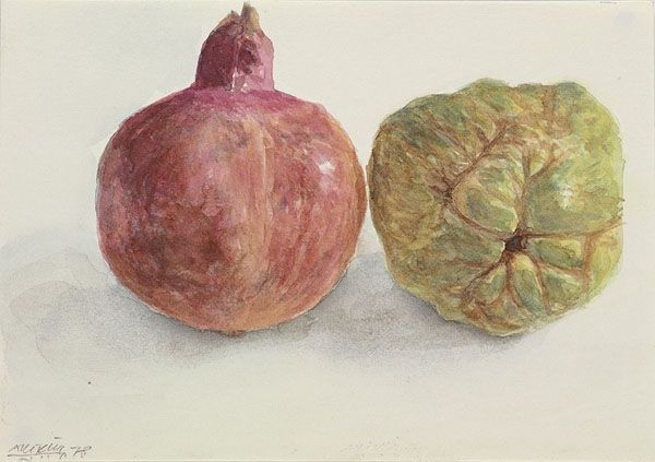 This watercolor still life of quinces and a pear, by Balthus, is all about seeing. Not just looking, but a slower, more deliberate kind of seeing. The fruits are rendered with the bare minimum, almost like a haiku. The colors are washed out, pale yellows and greens, a bit bruised, evoking a strange feeling. I love the way the watercolor bleeds at the edges of the fruits, giving them an ephemeral, dreamlike quality. It's as if Balthus wants us to consider the impermanence of things. Notice the one fruit on the left. See how it's darker, with layers of green and brown? The marks there feel less deliberate. Is it about the process of observation itself, about how we piece together our understanding of the world through tentative, evolving marks? Balthus's work has often reminded me of Morandi. Both were so focused on the everyday. Not for some grand statement, but because there's a whole world to discover in the quiet corners of the ordinary. Art isn’t about answers. It's more about the questions.