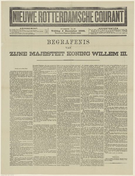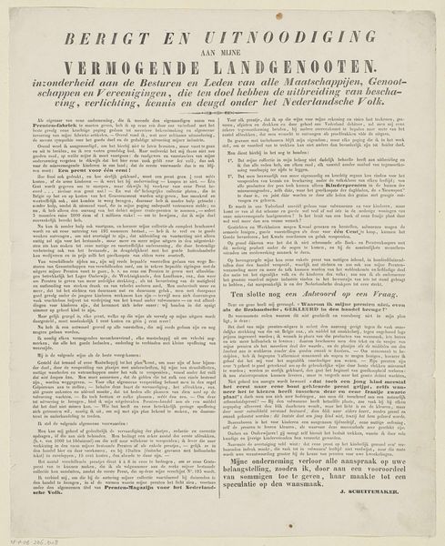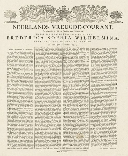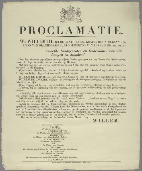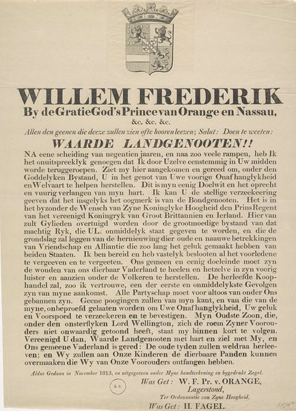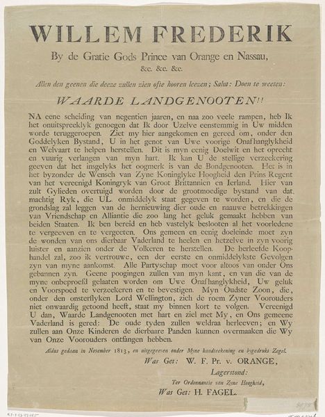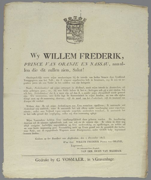 Curator: This intriguing print documents a pivotal moment: the return of Prince Willem of Orange, later King Willem I, to the Netherlands in 1813. Editor: It's visually quite austere. Mostly text, except for the heraldic crest. Almost feels… functional, like a public announcement more than a celebratory artwork. What feeling do you draw from it? Curator: Considering the tumultuous period after French occupation, I perceive resolve rather than jubilation. Willem is careful in his choice of language, his manifesto to his “dear compatriots” expresses restoration, national healing, promising renewed prosperity by reassuring people about independence. Editor: He's actively positioning himself. Notice he mentions the assistance from "His Royal Highness the Prince Regent of the United Kingdom." Aligning himself with Britain projects a certain… legitimacy. Curator: Precisely! Neoclassicism, the prominent style of the era, embraced these notions of order and stability. Editor: So this isn’t simply an announcement, it's carefully crafted political messaging distributed through a print. What are the cultural implications here in terms of imagery? Curator: The very act of creating a reproducible image implies widespread distribution and accessibility. Though calligraphy does represent fine art, creating multiples also acknowledges that power resides in reaching a large population at a specific period in time. This work’s function also shows that it’s more important to express shared heritage than focus on his authority alone. It serves as evidence to encourage others in their experience. Editor: So while visually modest, its socio-political ambitions were grand, connecting Willem's return with themes of national revival and forging alliances to legitimize his place as the nation's new head of state. Curator: Yes, it invites a more thorough reflection on the influence of politics, print culture, and identity formation within this very specific timeframe of rebuilding in 1813. Editor: This reading reveals how we should interpret this moment. By reading an image this way, we find that visual choices become indicative of so much more, like nationalism, legitimacy, alliance-building. The object has now shown how political will, power, and identity formation play on paper, so to speak.