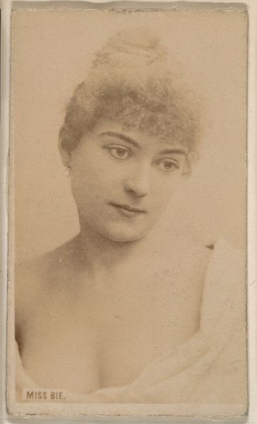 Curator: Immediately, I’m drawn to the soft tonality—an almost dreamlike quality. Is this warmth intended to invite, or is there something else at play? Editor: Let’s contextualize it. This is “Card 303, Vernoni Jarbeau,” a piece from the Actors and Actresses series created between 1885 and 1891 for Virginia Brights Cigarettes. Allen & Ginter were tapping into celebrity culture to sell tobacco. Curator: Indeed. The figure is centered, the composition fairly straightforward. Note the careful arrangement of her hair, cascading curls providing texture and frame to the face, drawing us into an almost hypnotic gaze. It adheres closely to academic artistic conventions. Editor: And reinforces very specific ideals of feminine beauty at the time—ideals used to push a product that, let's remember, was actively harmful, especially to women, who were increasingly being targeted by tobacco companies. What’s romantic to some is complicit to others. Curator: Fair, but observe the balance of light and shadow across Jarbeau’s face—how the chiaroscuro models her features. It isn’t merely about pushing a product; it’s about aesthetically elevating an image through artistic technique. This careful contrast imbues the image with vitality. Editor: That very "vitality," sold at the expense of the same people buying cigarettes! We can appreciate artistic skill, certainly, but also acknowledge the context in which it was employed. This card, with its seemingly innocent portrait, served to normalize and promote the tobacco industry’s grip on society. Curator: Still, I can’t deny the image's seductive appeal. The artist successfully captures something intimate, personal. This feeling is due to the use of depth created with delicate lines. The photograph and drawing seem in conversation to find an idealized beauty. Editor: And by probing beneath its attractive veneer, hopefully, we’ve encouraged a slightly more critical and historically grounded engagement with this object. Curator: Hopefully, you'll be inspired to observe, question, and appreciate the visual language being offered by works such as these.