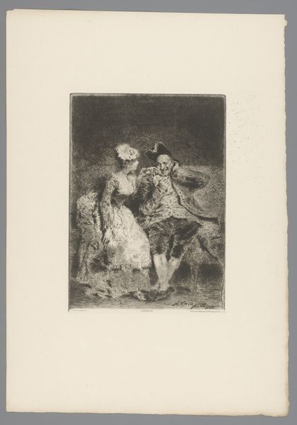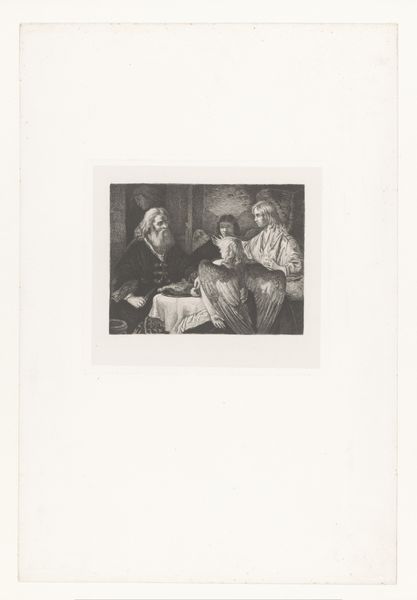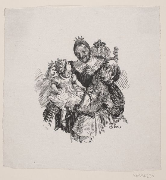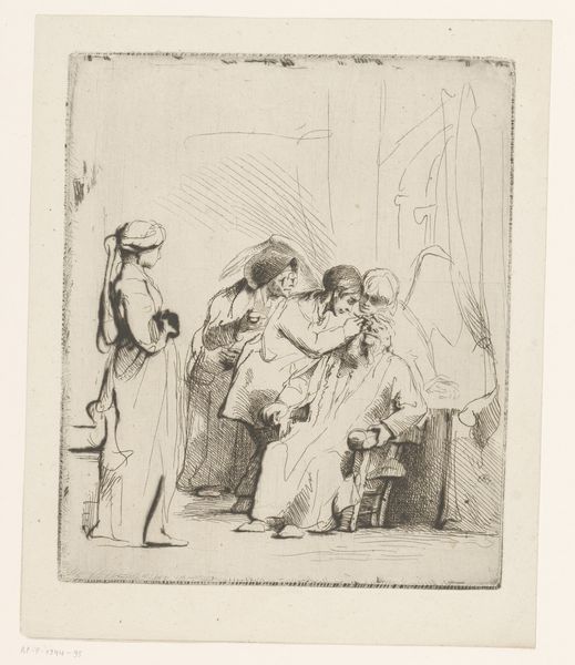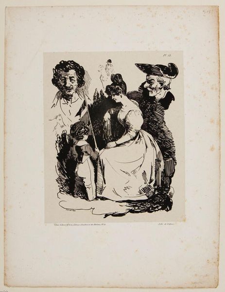 Editor: Here we have "Young Woman with Child and Sketches of Figures" by Nicolas Toussaint Charlet, made in 1828. It's an etching, primarily in ink. I’m immediately struck by how this everyday domestic scene is juxtaposed with these almost caricatured portraits in the background. It gives the piece a really dreamlike quality. What's your take on this combination? Curator: Ah, yes! It does feel like stepping into someone's mind, doesn't it? Charlet was known for his Romantic sensibilities. But there’s also a delightfully raw energy, as though the plate was etched in one feverish session! Perhaps the background figures represent fleeting thoughts, societal pressures, or even idealized figures looming over this mother and child. What does it evoke in *you*, seeing them peeking over the scene? Editor: I suppose it creates a sense of unease. The woman and child seem vulnerable, while the figures, with their exaggerated features, seem to mock or judge. Almost like a play on idealized motherhood. Curator: Precisely! Or perhaps it reflects the artist's internal dialogue. Was Charlet questioning or perhaps celebrating the roles within familial structures? Look at the deliberate shading around those background faces, which seem unfinished somehow... What stories do *they* want to tell us, hidden within the surface? And is it even fair to reduce a lived human moment into simple binaries like “good” or “bad” ideals? I see a quiet but firm embrace that transcends any commentary of background ideals that judge, and what you see are simply shadows of an ever present noise... what do you see the child doing in the artwork, by contrast? Editor: I think the child’s hand gesture directs our reading of those ‘noisy figures’, with the pole he/she/they are holding pointed upward like they want us to notice these presences! I never would have noticed that intentional juxtaposition before. Curator: Art...it is nothing if not a conversation. Thank you! Editor: Definitely! This has really changed my perception. It's more complex and thought-provoking than I initially realized.