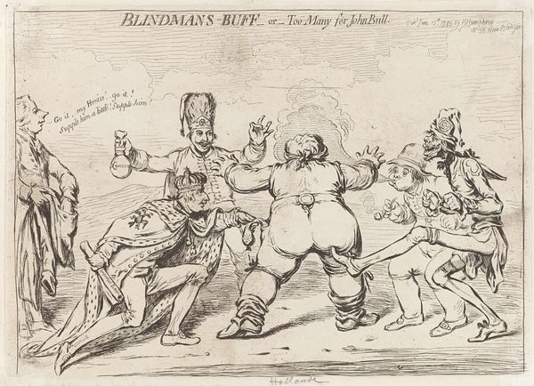 Curator: Ah, here we have James Gillray’s "Blindman's Buff or Too Many for John Bull," possibly from 1795. This piece, rendered with etching and paper, exemplifies the artist's sharp satirical wit during a tumultuous period in European history. Editor: What a scrum! My immediate thought is a muddle of confused figures – John Bull appears cornered, and there’s such kinetic energy conveyed through the etching lines. A visual representation of chaos, wouldn’t you say? Curator: Precisely. Gillray uses the popular game as an allegory. John Bull, representing England, is blindfolded, beset by European powers seeking to exploit its vulnerabilities, particularly during the French Revolutionary Wars. This print critiques political avarice, portraying figures like those symbolizing Austria and Prussia gleefully taking advantage. Editor: Absolutely, look at the figure in green, seemingly Emperor Francis II with his hands raised, in what is now referred to the "OK sign", though here it is seemingly more akin to a child sticking its fingers out at someone. Curator: Yes, his gestures serve multiple symbolic roles, highlighting contemporary anxieties about European alliances and power dynamics. Editor: Notice too the symbolism of the items being brandished like trophies. It highlights the tangible impact of greed on John Bull's resources. How would the public have perceived this work, do you think? Curator: With a knowing nod and perhaps a bitter laugh! Gillray’s prints were widely circulated, influencing public opinion. He tapped into existing anti-establishment sentiment, offering a critical perspective on the handling of international affairs and economic policies. He captured the mood and anxieties of the period brilliantly. Editor: Gillray’s impact resonates through his potent use of visual symbols to expose hypocrisy and illuminate the often-murky world of politics and societal pressures. It speaks to something innate in the human condition, doesn’t it? Curator: Indeed, seeing the world through the artist’s incisive critique can leave a lasting impact, prompting us to examine contemporary political theatre with the same level of skepticism. Editor: Yes, even though the historical figures may have passed from the scene, the patterns and temptations they represent feel enduringly familiar, if you ask me.
