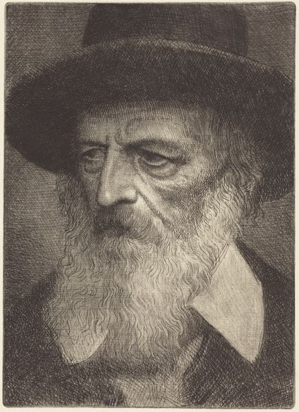 Editor: Here we have Alphonse Legros' "Self-Portrait, 4th plate," an etching. It's…intense. The subject’s gaze is averted, which creates this feeling of introspection, and I'm curious to know what thoughts might be swirling beneath the surface. What do you see in this portrait? Curator: Well, I see more than just introspection; I see a carefully constructed identity grappling with its place in a rapidly changing art world. Consider the social context of the late 19th century: rapid industrialization, social upheaval, and burgeoning artistic movements challenging academic traditions. An artist like Legros, deeply connected to realism, faced pressure to adapt while remaining true to his convictions. Editor: So, the "intense" feeling might stem from the tension he's feeling? Curator: Precisely! This isn't just a face; it's a statement. The heavy lines and somber tone might reflect the anxiety of an artist navigating a shifting landscape. The gaze averted can be interpreted as resistance. Think about it: Who had the power to dictate artistic tastes back then? Academic institutions, wealthy patrons...Legros perhaps turns his face away from that pressure. Does this portrait push us to confront ideas about self-representation and the forces that try to shape an artist's identity? Editor: That’s fascinating. It really changes my perspective to think of the portrait not just as a representation of the artist, but as a reflection on the art world itself and his position within it. Curator: Exactly! Considering how social dynamics influenced the production and reception of art, we move closer to understanding not just what the artist looked like but also how his work engages with the social fabric of his time. This portrait speaks volumes, doesn't it? Editor: It does. Thank you, I never thought of portraiture this way before.