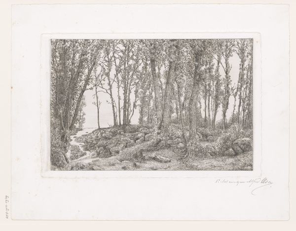 Curator: This is Alfred Elsen's "Bosgezicht met links een beek," or "Forest View with a Stream on the Left," created in 1879. It's an etching and engraving, currently held in the Rijksmuseum. Editor: It's striking. My initial sense is one of quietude. The tonal range is delicate, almost whispering, but the texture! It begs a closer look to appreciate the marks left by the artist. Curator: Definitely. Forests carry a lot of symbolic weight, don't they? A place of mystery, danger, but also refuge and profound introspection. What aspects resonate with you most looking at it? Editor: It's the meticulousness, really. Imagine the time involved in rendering each tree, each rock. Elsen, I suppose, used tools capable of great precision; that informs how I perceive his dedication. What sort of artistic training might he have had? Curator: I think Elsen likely understood how to employ realism in his landscapes. The realism in those trees feels very studied, each trunk has individual qualities in tone and directionality. Consider the Romantic movement prevalent during this time; a longing for the sublime, which found itself so often expressed in the unyielding and dominating power of nature. The symbolism is rife with connections to the cultural ethos. Editor: So, did Elsen take inspiration directly from the natural environment and carefully replicated the scene through slow, manual work? The repetitive action involved is compelling. It is so interesting to consider art beyond that of something to merely to be contemplated. Curator: Yes, and you bring up an important element: consider the accessibility of prints in contrast to painting during this period. Multiple impressions allowed broader audiences to engage with the image and by extension, to connect with and project onto that cultural ethos of landscape. Editor: Very good points. It’s easy to get lost in romantic readings and miss these tangible facts. Thanks, that really brings into focus what makes Elsen's landscape worth engaging with for modern eyes. Curator: A fruitful exchange. There are more symbolic forests to explore. Editor: I look forward to exploring them now with an enriched awareness to the artist's means!