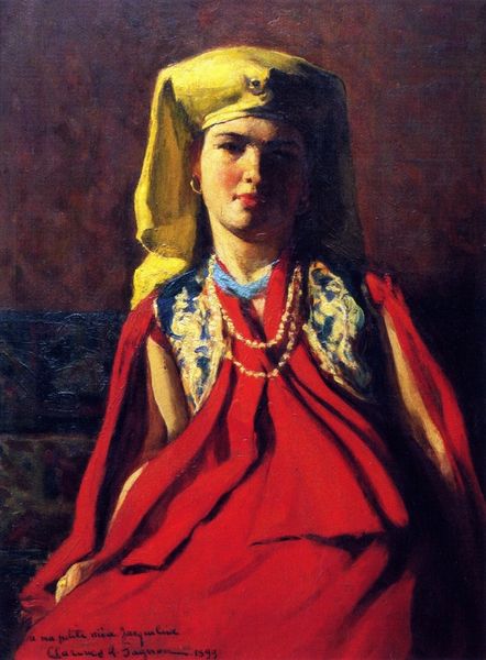 Jean-François Portaels, a 19th-century Belgian artist, painted this portrait in oil on canvas. The smooth and fluid application of paint is central to the work. The artist has blended the colors to create soft transitions between light and shadow, giving the woman's skin a luminous quality. Portaels paid close attention to the details of her garments and jewelry. Note the intricate patterns of the headdress, and the way light reflects off the metallic surfaces, and observe the folds and drapes of the fabrics to convey their texture. The artist's skillful handling of the oil paint, layering thin glazes to build up depth and richness, lends the painting a sense of realism. However, this realism also depends on a whole system of representation, through which people of other cultures are made available as images for consumption. It is this context, as much as Portaels’s skill, that determines the picture's meaning.