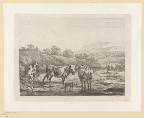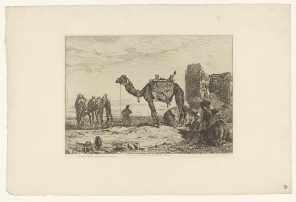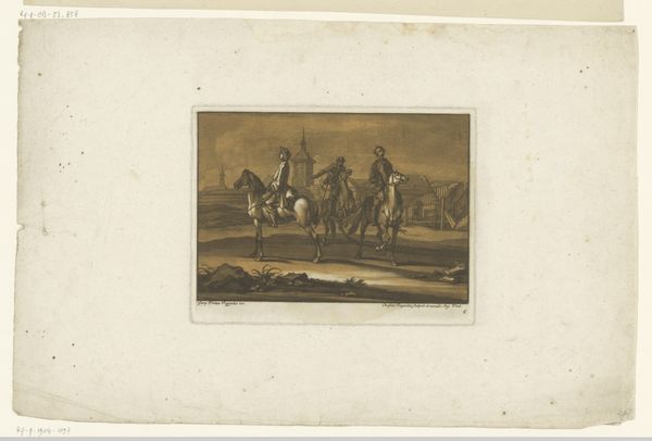 Curator: Christian Rugendas created this ink drawing on paper, sometime between 1718 and 1781. It's called "Two Packed Horses Outside a City Wall, with a Child Seated on One." Editor: Immediately, I’m struck by the contrasting stillness and potential for movement. The horses are posed, yet they seem poised for action just outside what appears to be the city walls. It has a quiet intensity to it. Curator: Indeed. The composition guides our eye from the figures to the architecture and distant landscape, creating a dialogue between the man-made and natural world that speaks to urbanization of the 18th century and our control over nature. Rugendas seems fascinated by both genre painting and landscape art; and this piece beautifully straddles these two traditions of the Baroque. Editor: From a purely formal perspective, the restricted color palette adds to the drama, emphasizing tonal variations, and the interplay of light and shadow contributes significantly to the solemnity. This carefully controlled chiaroscuro not only creates depth, but also imbues the scene with a strong emotional charge, focusing the observer's eye towards the figures of interest: the child and the heavily packed horses. Curator: I’d argue Rugendas employs those formal techniques to say something specific about 18th-century social structures. The heavy packing suggests trade or travel, activities inseparable from the social and political climates of that time. The child suggests a human element amidst the commercial activity. We see that transition towards modern economies with the commercial trade and travel and all that labor rests literally upon the beasts of burden, a metaphor for that labor within burgeoning economies. Editor: It’s true that the child seated atop this precarious cargo certainly gives one pause, it draws attention to vulnerability amid perhaps impersonal or even cruel mercantilism. Yet Rugendas shows that fragility against the stable lines of those angular crates atop the horses and again against the imposing wall that protects those activities. Even small lives find stability and progress inside of emerging city economies. Curator: Looking closer, the cityscape in the backdrop seems equally significant. It grounds these activities and the human figures within an economic reality. What seems like a casual scene is instead a microcosm of 18th-century life. Editor: By analyzing how Rugendas contrasts figures with angular forms and open vistas in subdued tones, we can appreciate how he balances emotion and geometry to convey depth. Curator: Absolutely, and studying his use of symbolism illuminates broader historical and social dynamics, offering us a layered understanding of that transformative era. Editor: Agreed. What at first appeared to be just a quiet moment ends up inviting contemplation about our roles within greater, perhaps unavoidable structures.