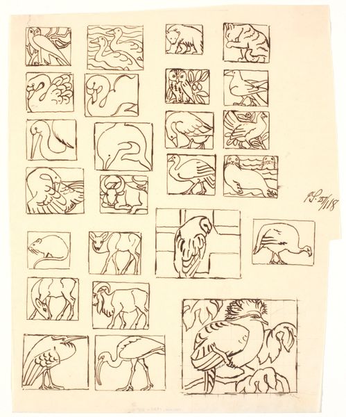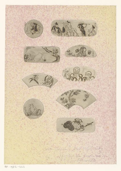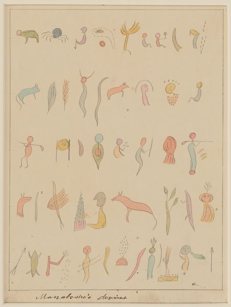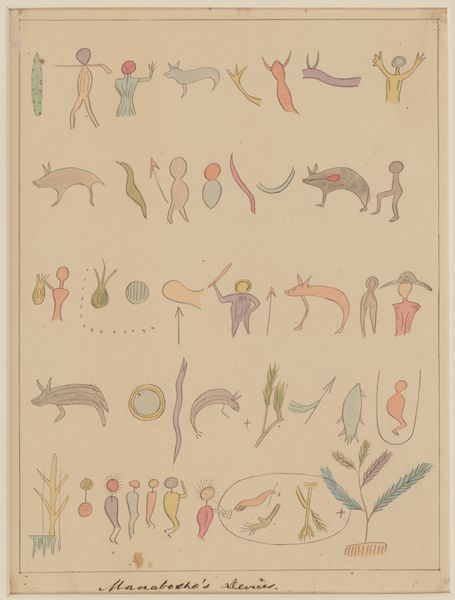 Editor: This is "Manabosho's Devices" made with watercolor and drawing materials, dated between 1849 and 1855 by Seth Eastman. It's a really intriguing work; the figures seem almost like a code or a series of symbols. What exactly am I looking at here? How do you interpret this work? Curator: This image presents a fascinating, albeit complex, narrative tied to the figure of Manabosho, a significant trickster and culture hero figure within Anishinaabe (Ojibwe) traditions. Eastman’s rendering of these devices is through the lens of a 19th-century artist, within the context of Westward expansion and cultural exchange. But it depicts figures with cultural roots predating colonialism. The imagery uses these graphic depictions of animals, figures and elements of nature in an order. To begin understanding this, what resonates most with you? Is there an image that attracts your eyes? Editor: I'm drawn to the figures with the sun-like circles around their heads, what is the significance of those representations? Curator: Those are incredibly important. The radiant circles often represent spiritual power or connection to the Great Spirit. In the context of cultural exchange during that period, understanding this symbolism becomes crucial. Were these accurate portrayals, or romanticized interpretations viewed through a colonial lens? This piece raises important questions about representation and power. How does Eastman's approach influence how we understand Indigenous knowledge and beliefs today? Editor: So, while on the surface, they appear almost childlike or simple, these symbols actually carry a lot of weight in terms of power and spirituality within Indigenous traditions, which is complicated by Eastman’s perspective as an outside observer. Curator: Precisely. It forces us to consider whose story is being told and how cultural narratives can be appropriated or misinterpreted. Reflecting on Eastman’s positionality allows us to engage in a crucial dialogue about cultural sensitivity. I hope it has highlighted how art objects are produced in specific sociocultural conditions. Editor: It definitely has. Thank you for providing context for approaching such depictions.