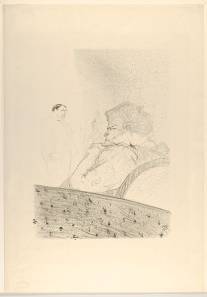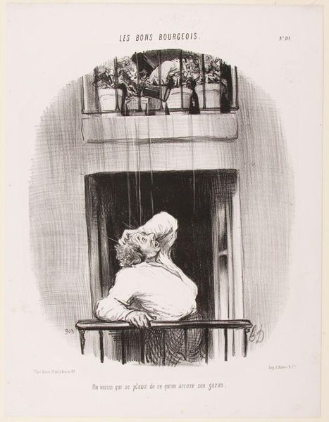 This lithograph by Honoré Daumier, titled "A Neighbour Complaining about the Watering of his Lawn," captures a moment of urban discord. The composition is structured vertically, dividing the scene between the upper balcony with its neatly arranged flower pots, and the lower one where a figure is caught in a downpour, mouth agape. Daumier's use of line and shading directs our attention from the ordered, almost sterile setting above, to the chaotic, expressive figure below. The rain is rendered as a series of stark, vertical lines that act almost as a barrier, visually separating the two worlds. This division implies a critique of bourgeois society and the inherent tensions within its stratified spaces. The stark contrast between the meticulously cared-for flowers and the disheveled, complaining neighbor suggests a rupture in the perceived order. Daumier destabilizes conventional expectations of urban harmony, revealing underlying frictions. The lithograph serves as a sharp commentary on the absurdities of social class, captured through the formal relationships of line, space, and expression.