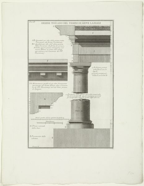 Editor: This is Giovanni Battista Piranesi's "Onderdelen van het Theater van Marcellus te Rome," from around 1756-1757. It's an engraving. It’s so detailed, almost technical. What do you see when you look at this piece? Curator: Primarily, I see a masterful orchestration of line and form. Note how Piranesi utilizes contrasting depths and intricate linework to delineate each architectural component. Observe the deliberate separation of elements—each given its own pictorial space, encouraging careful examination of its formal qualities. How does this structured layout contribute to the print's overall meaning, in your opinion? Editor: I guess it emphasizes the individual components rather than the theatre as a whole? It almost feels like a deconstruction. Curator: Precisely. He directs us towards an analysis of form itself. The print becomes a study in contrasts: light and shadow, solid mass and void. This visual dialectic, present in every carefully rendered line, elevates the architectural fragment to the level of pure visual experience. Do you discern a particular geometric structure underlying the composition? Editor: Now that you mention it, there’s a strong sense of verticality balanced by the horizontal elements of the base and cornice. And all those curves... Curator: Exactly. These contrasts give the work dynamism. Ultimately, Piranesi's focus on structure and his arrangement of line creates something more profound than architectural documentation; it achieves a sort of deconstruction. Editor: I never thought about prints having that type of visual depth and complexity. I see so much more now!