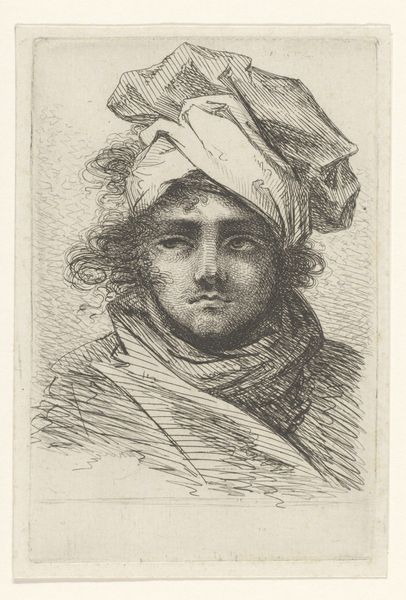 Curator: The initial feeling I get is of delicate melancholy. The light catches the subject's face in such a way as to render him both beautiful and slightly sorrowful. Editor: That's an interesting interpretation. I see a portrait, “Brystbillede af en ung Mand”, or "Bust of a Young Man," a drawing from between 1733 and 1816, created by W.A. Müller. It’s currently held here at the SMK, the National Gallery of Denmark. Looking closer, it's an engraving, a print. Curator: Engraving is so interesting, isn’t it? How it transforms an image into a symbolic record almost, ready for mass dissemination. Editor: Precisely! The act of engraving inherently places this young man within a broader socio-political sphere. Printmaking democratizes access to imagery, removing the exclusive hold paintings once held over representation. Curator: The details embedded within such readily-available portraits carry so much cultural weight. Think about this: his hair, almost cascading down his shoulders in waves. It seems a direct symbol of freedom, but perhaps even a hint towards more rebellious undertones. Editor: A signifier of class, perhaps? Someone wealthy enough to have leisure. His clothes may point towards someone affiliated with an emerging merchant class perhaps. How do you perceive its role today, do you believe the symbolic representation remains potent in a digital age flooded with images? Curator: It's about recognizing echoes. These images shape our perception of archetypes, historical memory. Even digital images are informed by conventions established centuries ago in works like these. He represents ideas and ideals carried forth in ways that might be visible only if you know where to look. Editor: Yes! Recognizing art's capacity to build public narratives about an individual and understanding how portraiture actively constructs these concepts of status and personhood is fascinating. This has certainly shed some new light on the importance of this piece. Curator: Agreed. Every time we analyze art through diverse viewpoints like ours, we unearth another perspective, new possibilities.