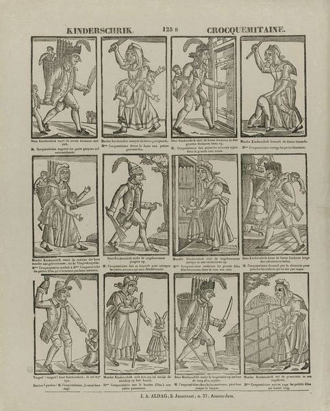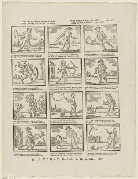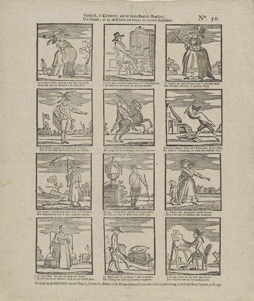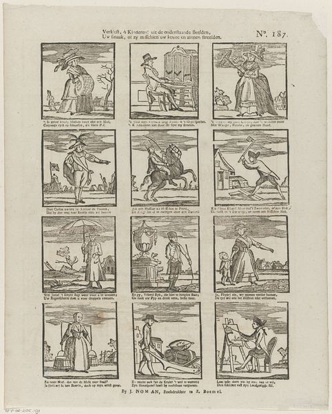Editor: This engraving, "Elk doet wat hy verkiest in 't voegen van zyn smaak..." roughly translates to "Each does what he prefers according to his taste..." It’s attributed to Johan Noman and dates to sometime between 1806 and 1830. The images feel so… everyday. Almost like snapshots of Dutch life. How do you interpret this kind of “genre painting” presented as a print? Curator: It’s crucial to consider the social function of prints like this in the 19th century. This wasn't fine art meant for a gallery; it was designed for mass consumption. It served an educational, even moralizing, purpose, but was also undoubtedly a popular source of entertainment and perhaps news dissemination. What strikes you about the title in relation to the individual scenes? Editor: Well, the title emphasizes individual preference, but the images themselves portray very common, almost mundane activities, mostly performed by men. There’s someone fishing, another hammering, others transporting goods or walking. There’s not a great deal of...choice seemingly on offer? Is it that freedom resides in the *attitude* with which one approaches these tasks? Curator: Exactly. It suggests a burgeoning sense of individuality within a rapidly modernizing society. These weren’t portraits of the elite. Rather, we’re looking at a representation of daily labor and recreation that was starting to circulate amongst a growing middle class, giving them a new consciousness of themselves as members of society with individualized agency. Who gets to participate in this vision of Dutch life? Are there any absences that strike you? Editor: Good point! There seem to be few women represented here and the whole collection seems quite gendered! Looking at it through that lens it is quite exclusionary. Curator: Precisely, and analyzing art in such ways help expose what cultural messages they convey to the masses and in which way are these political messages conveyed. Editor: Thanks! This print suddenly tells a larger story about the public role of art and its ties to socio-political forces at work! Curator: Indeed. Recognizing the social function and omissions in art provide rich understandings of the past.