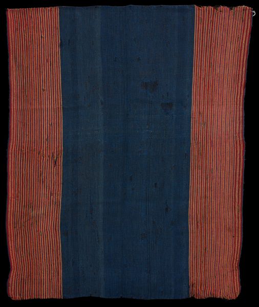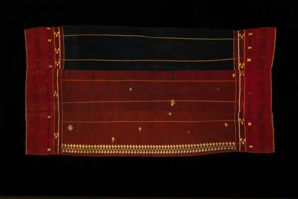 Curator: Welcome. Here we have a "Half Llklla (shawl)" created between 1960 and 1970. It's a remarkable example of Yampara textile art, currently residing here at the Minneapolis Institute of Art. Editor: My initial impression is one of quiet strength. The piece relies on these bold horizontal stripes of geometric patterns above this striking, solid dark mass. There's something deeply grounded about it, formal yet simple. Curator: Yes, Yampara textiles carry significant cultural weight. Llklla shawls like this one often signify status, community identity, and are integral to ceremonies and social life within the Yampara communities of the Andes. The geometric patterns aren't just decoration; they are narratives woven into the very fabric, telling stories of ancestral knowledge and the relationship between the people and their land. Editor: And these precise diamond motifs, meticulously repeated, create a subtle rhythm and reflect the care put into each individual stripe. The colors— the vibrant reds set against that grounding deep blue—further reinforce this feeling of both energy and stability. It speaks to an ordered way of thinking, carefully considered balance of contrasting features in its material being. Curator: Exactly. It's believed that the colors used also held specific meanings, possibly representing elements of nature or spiritual beliefs within the Yampara cosmology. The weaving techniques, passed down through generations, represent a profound connection to heritage and an act of cultural preservation. By choosing specific materials and using those intricate geometric patterns, the weaver asserted Yampara identity and resisted cultural assimilation. Editor: It's fascinating how something that, at first glance, appears quite simple can hold such layers of cultural meaning. The starkness, which I appreciated from a purely visual perspective, deepens considerably with the historical understanding you provide. It transforms my appreciation of it. Curator: And hopefully, the viewer’s too. Thinking about this shawl forces a dialogue between us and their communities’ past, it helps to acknowledge their struggles, as well as admire the exquisite beauty they chose to reflect in the process of maintaining these ancient cultural practices. Editor: A powerful testament to the communicative capability embedded within textiles, a voice woven with profound visual restraint and deeply imbued purpose.