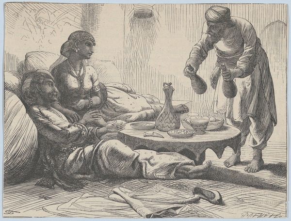 Editor: This is Charles Dana Gibson’s 1917 ink drawing, "And the fool, he called her his lady fair." It feels…morbid, almost a commentary on delusion. What do you see in this piece? Curator: Well, firstly, aren't titles wonderful for pulling us into a work? “The fool,” “lady fair” – there's irony dripping here. To me, it's Gibson jabbing at the societal charade of beauty and wealth. It's got this ‘memento mori’ vibe, a reminder that beneath the jewels and fancy dresses, we're all just bones waiting to happen! Think about the era; 1917, amidst the horrors of WWI, perhaps Gibson's lancing at that superficiality he observed? Don’t you think? Editor: Absolutely! The juxtaposition of the lavish setting with the skeleton is striking. The title gives a grim view. What strikes me the most is, are those cigarette fumes surrounding them both? Curator: Indeed! Those rising curls of smoke swirling like a death shroud or even the serpent in the Garden of Eden. Are they complicit in their ignorance, breathing in decadence while ignoring the abyss? Perhaps Gibson, through sharp strokes, asks, are we all fools in denial? What is decadence worth? Editor: I never thought of the smoke as a symbol like that! The artwork seemed pretty dark and direct before but now has so many more layers of interpretations. Curator: Isn't that the marvelous mayhem of art? It dances with us, teases out new revelations with each gaze. The fool may love the “lady,” and that fool might even be ourselves at times, charmed by gilded illusions. A tasty reflection on our modern delusions, what? Editor: Yes! It makes one think twice about chasing fool's gold. Thanks so much for your perspectives.