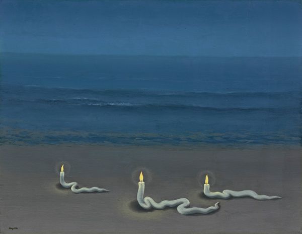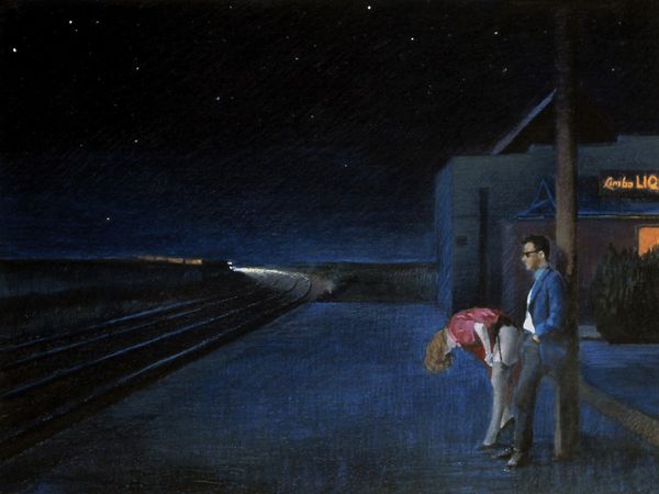 Editor: This is Devin Leonardi's photography titled "Laconia." There's a strong surreal quality to it; a group of figures illuminated in this striking blue hue on what seems to be the shore of a lake. What elements of the composition stand out to you most? Curator: The stark monochromatic palette commands immediate attention. Note the photograph's overall composition, this careful layering of horizontal bands: the deep, near-black line of trees against the blue gradient of the sky; the rippling water reflecting the dark mass; and finally the softly illuminated boat grounded in a sliver of shoreline. It evokes a liminal space. Editor: Liminal...like between worlds? Curator: Precisely. Consider the strategic use of light and shadow. The figures in the boat are rendered almost ethereally, their forms softened and subtly glowing, contrasting sharply with the depth of the blue that surrounds them. It gives rise to the sensation of dream or memory, less grounded in concrete reality. The flatness versus the three-dimensionality is very striking. Editor: It's interesting how the lighting almost flattens them while also highlighting them. How the structure leads our eyes across the picture is something that I hadn't thought of at first. Curator: What were your initial assumptions regarding the material qualities, scale and form? The medium, after all, also becomes part of the structure and affects our perceptions. Editor: I think it is bigger than I initially thought it was and appreciate how all the parts complement each other and how Leonardi used space. Thanks! Curator: And that space dictates how we experience that light. Always consider, even within what seems an evocative scene, the intrinsic structures the artist employed to create that evocation.