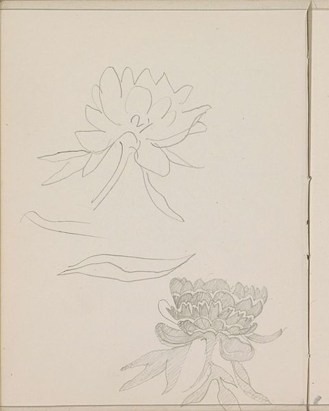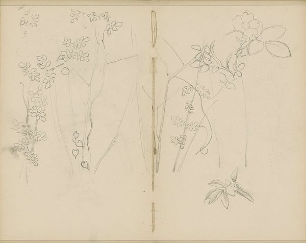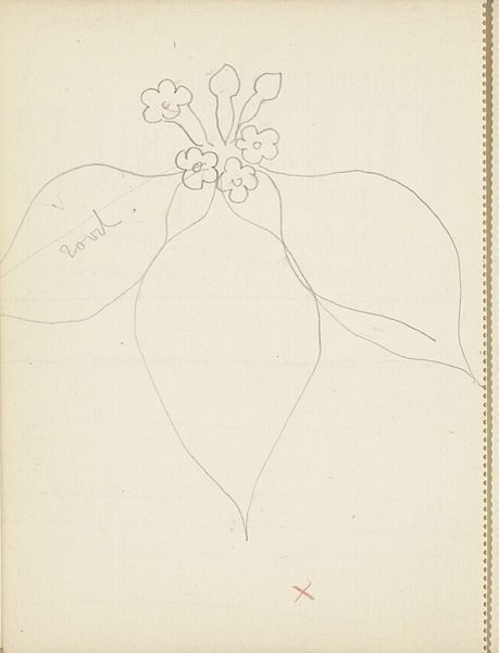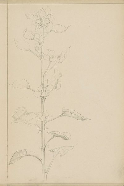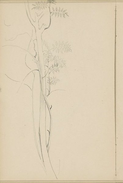 Curator: Here we have “Plant met bladeren,” a drawing executed in pencil on paper by Antoon Derkinderen, likely dating from between 1889 and 1894. Editor: It’s delicate, almost hesitant. The lines are so light, the whole composition feels like a fleeting thought captured on paper. Curator: Exactly. Observe how Derkinderen employs a restrained line, focusing purely on contour to suggest form. The leaves are merely outlined, allowing the viewer's eye to complete the shapes. Editor: There's a simplicity that transcends mere botanical illustration. Was sketching of flora a common practice for artists at that time, reflecting perhaps the influence of burgeoning botanical sciences? Curator: Sketches of this kind provided raw material for larger, more resolved works, yes. Consider this as part of Derkinderen’s artistic process; a tool to contemplate the essential form of the plant, exploring ideas of structure and growth. Editor: It also prompts us to reflect on art institutions. Are museums places to store incomplete thoughts as valuable pieces? Does the aura of display elevate what would normally be a discarded sketch into a significant artwork? Curator: The 'finish' is immaterial here, I think. This is art that privileges observation. The unfinished quality allows us to enter the artist's mind, experiencing their immediate perception of the natural world. Editor: Perhaps. It makes me consider how sketching served as an accessible artistic activity for people from different social classes and how museums influence that practice through display and valorization. Curator: Regardless, “Plant met bladeren” showcases Derkinderen's ability to distill form to its purest essence, to appreciate the intrinsic beauty of the plant’s skeletal structure through basic components: lines, their direction, their varying weights, and the negative space in-between. Editor: So it does. Its raw simplicity definitely brings focus to the practice of visual learning and recording, emphasizing the democratization of botanical drawing as artistic inquiry in a socio-political dimension. Curator: Indeed. It provides a window into the fundamentals of artistic vision. Editor: A brief yet pertinent reminder of that moment's cultural practice.