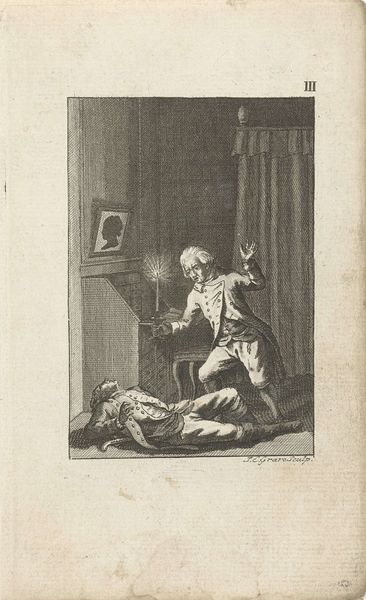 Curator: This engraving, housed here at the Rijksmuseum, is titled "Man in een slaapkamer bij een man in een bed," or "Man in a bedroom with a man in a bed." It dates back to 1828, the handiwork of Philippus Velijn. Editor: My immediate response is one of dramatic tension. The lighting, stark as it is in this medium, creates a sense of unease. The textures of the bedclothes and the man’s garments seem palpable, rough hewn perhaps. Curator: That palpable texture comes from Velijn’s skillful use of engraving to depict an interior scene that carries quite a weight when we consider notions of privacy, masculinity, and perhaps even class in 19th-century Netherlands. It reflects the Romantic fascination with emotional intensity but filters it through a decidedly bourgeois lens. Editor: Indeed. Consider the composition: the stark lines of the bed juxtaposed with the shadowy figure lurking in the background. What were the prevailing methods for crafting this print, and what were the contemporary debates around printmaking’s place in the broader art world? Curator: Printmaking was vital to democratizing images, making art accessible, particularly politically charged imagery. The materials - copper plates, inks - were becoming increasingly standardized but the skill of the engraver dictated the emotive power. Look at the rendering of fabrics; social status announced through things. Editor: And we should look closely at the implements laid carefully upon the table: is that a chalice? Is it simply another luxury object to be consumed? I do want to turn to the canine participant—they give such vital energy! Curator: Yes, the dog seems crucial, as it seems to both instigate conflict and serve as material symbol of upper middle-class domesticity—a constant tension evident in genre paintings such as this. It brings us to considering, in a contemporary context, what “domestic security” truly signifies and for whom. Editor: This has certainly opened my eyes to the multiple layers of interpretation embedded in seemingly simple scenes. The devil is always in the details of production and consumption. Curator: For me, this artwork brings to the fore many compelling narratives about domesticity and visibility. A seemingly conventional portrait opens a path to consider historical, social, and personal tensions and its ongoing relevance.