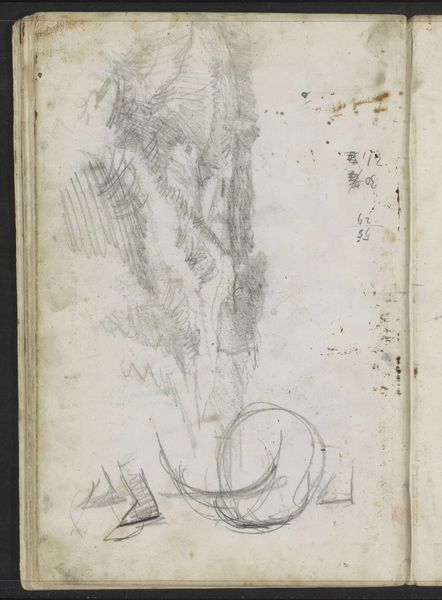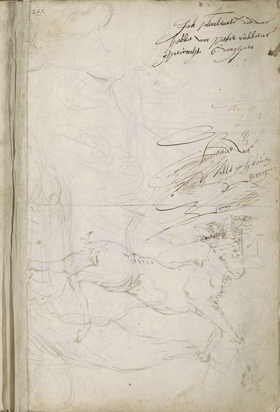 Curator: Oh, my, it looks like someone spilled their soul onto a page... there's such rawness to the sketch, it feels as though it just barely survived being tossed out. Editor: Here we have a sketch, probably dating from the 17th century and attributed to Paul de Vos, titled "Study Sheet with Still Lifes, a Vase, and a Dead Deer.” It is a pencil drawing on paper. Curator: Right. A dead deer. It’s positioned upside down, like a discarded trophy from a dream… or a nightmare. And there’s something so immediate in the hurried pencil strokes. Are those flowers? There's such a contrast in delicacy versus brutality, its startling. Editor: Considering that De Vos came from a family of artists, with a particular specialism in animal paintings for the Baroque aristocracy, its clear he aimed to capture realism. These drawings are preparatory studies to achieve anatomical precision, perhaps for larger commissions that often ended as trophies displayed on aristocratic estates. Curator: Precisely, yet look at the vulnerability! Those thin limbs, that drooping neck, not remotely glorious. It's more intimate than triumphant. You'd think such a prominent animalier of his time, sought-after as he was, would display the hunt differently. Editor: Well, his works were commodities within a system, reflections of status and power for both artist and patrons. The deer represents the hunt’s yield, evidence of human control over nature to reinforce the Baroque worldview. His preliminary sketches had to fulfill their goal, and still achieve visual effectiveness that pleases patrons and is admired by viewers. Curator: All true. Yet I cannot shake the feeling looking at it: it could be simply the quiet contemplation on mortality. De Vos just decided to note things and, yes, capture this very sad death; like noticing and preserving that very moment forever. Its such a different statement when extracted from the hunting scene and is isolated to represent a moment of pause and respect. Editor: I appreciate the point that you make about mortality. Still, for contemporary society where animal welfare occupies our moral and political thinking, we are bound to reconsider traditional imagery. De Vos’ sketch encapsulates not just a dead animal, but the living power dynamics between art, patrons, and audience. Curator: Oh, certainly. It's amazing, isn't it, how a few swift lines can echo so many centuries. Editor: Indeed; thank you for the company today. I'll move on and reflect more later.