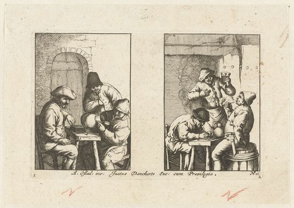 Adriaen van Ostade’s etching presents us with three men and an empty jug, a scene brimming with unassuming symbolism. The jug, now empty, speaks volumes about communal ties, a vessel that once held shared spirits now stands barren, echoing a sense of camaraderie either spent or longed for. Consider how the empty vessel motif appears throughout art history, from ancient Greek amphorae depicting scenes of bacchanalia to medieval Christian iconography where empty vessels can symbolize spiritual emptiness or unfulfilled potential. The cyclical nature of thirst and satisfaction plays out here, a rhythm as old as civilization itself. The jug, in its emptiness, transcends its material form. It becomes a mirror reflecting the viewer’s own experiences of yearning, satisfaction, and the transient nature of pleasure. This seemingly simple scene, charged with cultural memory, evokes powerful emotions, engaging us on a level that resonates deeply with the collective human experience.