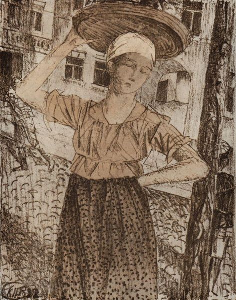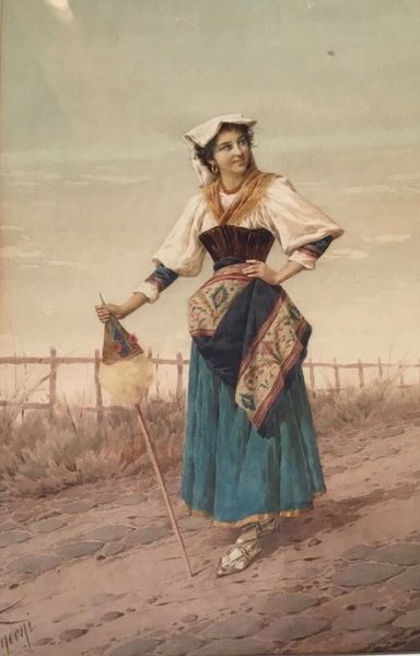 Curator: Here we have Carl Haag’s "Italian Peasant Girl," rendered around 1855 using watercolor and gouache. Editor: My goodness, she looks both regal and weary all at once. Such presence amidst what seems like an awfully barren landscape. Curator: Haag, though German, was quite taken with the romanticized vision of peasant life that was fashionable during that time. Genre paintings such as these idealized rural folk, but they also served to highlight specific cultural identities within the growing nationalist movements. Editor: You know, I feel that mix of pride and… exploitation keenly in her gaze. The meticulous detail of her garments, each thread lovingly rendered, juxtaposed with the rough texture of the terrain under her bare feet—it creates a potent sense of… disparity. Curator: Precisely! The piece straddles the line between realism and romanticism. Haag seeks to capture the lived reality but inevitably filters it through an artistic lens influenced by social currents. Editor: I see a symbol of resilience, wouldn’t you say? The weight of the harvest she bears—a cornucopia balanced on her head, yet her stance, though tired, seems steady. Almost triumphant! It makes me think of the labor and hardship often unseen behind such seemingly quaint snapshots of "traditional" life. It gives me a slight melancholic joy, I must say. Curator: The use of watercolor really enhances that contrast. The medium’s delicate transparency accentuates the softness and idealization. Still, the attention to detail is commendable, creating a somewhat complex narrative about this figure and the era. Editor: She really is stunning and haunting at the same time, almost as if the colours hold the feelings, but that's art, isn’t it? The art of sparking feelings. Curator: Indeed. Haag's work encapsulates a particular historical gaze, an attempt to capture a cultural moment rife with tension and romantic fantasy, viewed through a distinct Victorian lens. A valuable reflection piece.
