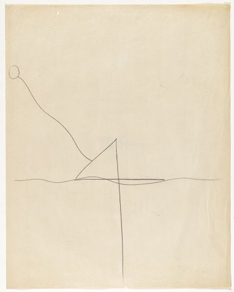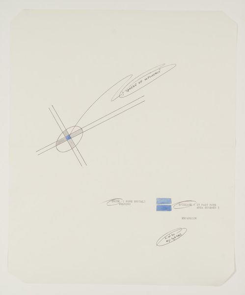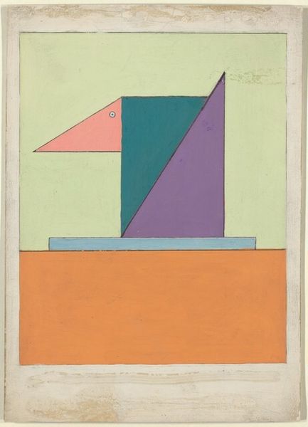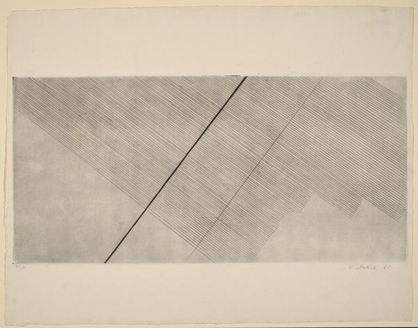Curator: Here we have Richard Mortensen’s "Composition (From the 'Nice' series)," a 1966 print employing acrylic paint. My first impression is that the cool tones give it an intellectual coolness, almost detached. Editor: Yes, "detached" feels right. It's striking how Mortensen creates such a minimalist statement with just lines and one solid shape. The asymmetry contributes to this detached affect, perhaps reflecting post-war European sentiments? Curator: Precisely. Formally, the interplay between the stark lines and that singular, bold triangle generates visual tension. The off-white background emphasizes the geometric forms, pulling them forward. Note how the lines extend beyond the implied edges of the larger implied geometric form. It seems intended to push the composition outside of its physical constraints. Editor: That tension seems to mirror broader societal unease of the era. There is an elegance to the work, of course, in its reduction to pure shape. But how does the title – specifically the parenthetical reference to 'Nice' – inflect your formal analysis? Given the charged social climate of the '60s, I can't help but wonder if that is somewhat sarcastic or subversive. Curator: An astute point! From my perspective, this sarcasm is unlikely and is meant to point toward Nice, France. The formal devices Mortensen uses creates dynamism, movement—qualities associated with that region’s history as a crossroads, a nexus of diverse cultures and aesthetics. He reduces complex concepts to elementary forms to address something universal. Editor: That reading adds layers. Knowing it could gesture toward Nice allows me to read the "detachment" instead as the serene distance of the bird’s eye view, seeing movements that aren't possible to observe from the street. But it still evokes complex reflections on cultural interchange during a volatile period. Curator: Agreed. What appears simple contains layers of nuanced formal relations and references, yielding continuous, stimulating analysis. Editor: Absolutely. It prompts questions that linger, inviting deeper examination of both artistic technique and the socio-political landscape of its time.