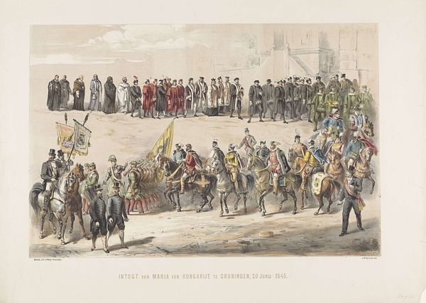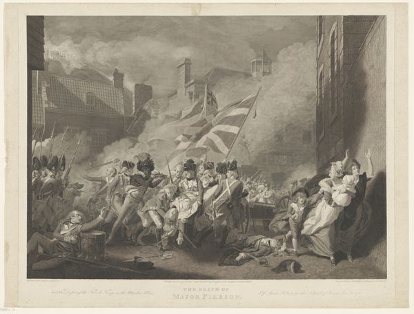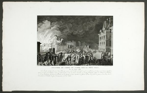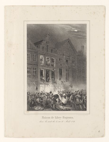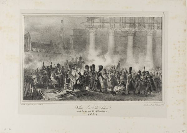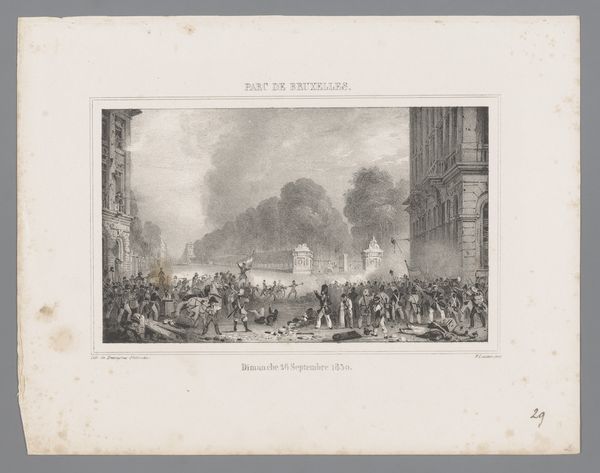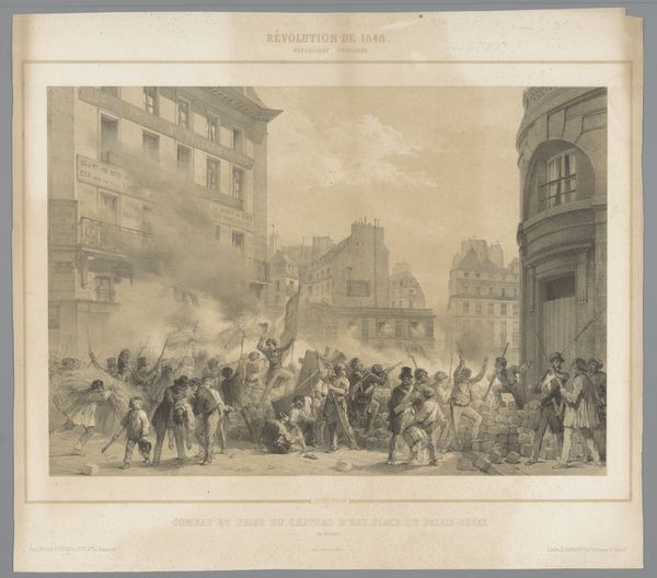 Curator: This lithograph, crafted by Jean Pierre Marie Jazet in 1831, is entitled "Strijd tijdens de Julirevolutie op de Rue de Rohan," depicting a scene from the July Revolution. Editor: Right away, there's this incredibly visceral feel, a maelstrom of action. It’s like stepping right into the heart of the chaos, isn't it? So much energy rendered in monochrome, so dense, smoky and gritty. Curator: Indeed. Jazet employs stark contrasts to amplify the drama, with gradations in tone lending depth to the architecture. The formal structure reinforces the narrative; look how the receding buildings compress the revolutionaries into this tight visual plane. Editor: Absolutely. There’s also this wildness, a raw urgency in how the figures are arranged. Like history itself is tumbling onto the cobblestones. And I notice that he captures the moment, freezing the action but letting us infer that the scene will change any moment. Curator: Notice, too, how Jazet frames the tension using perspectival techniques: The buildings on either side almost converge at the horizon, guiding the eye toward a focal point marked by the billowing smoke, almost reminiscent of the ‘sfumato’ that Leonardo uses. Editor: Yes, the atmosphere of tension and potential eruption. All of that is enhanced by the gray, hazy filter we view the entire scene through. It seems almost too neat for such a spontaneous event but, still the image pulls us in. We have a window to another time! Curator: It's a very detailed rendering of a pivotal moment, capturing both the revolutionary zeal and, frankly, the rather terrifying intensity of the historical event, presented with neoclassical compositional order. Editor: A dance of chaos and composition then. Curator: Precisely. Jazet compels us to engage with the revolutionary fervor as a structural spectacle of dynamic forces in tension. Editor: Gazing upon such intensity reminds me of what art historian Simon Schama wrote: History’s always messy, passionate… and rarely entirely coherent. So maybe this beautiful chaos is a truer portrait than it lets on.