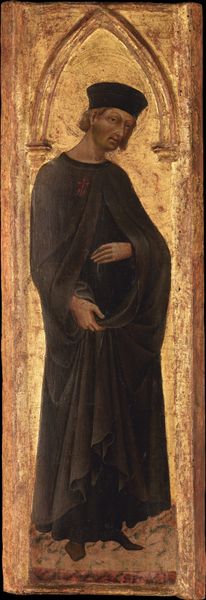 Curator: The stillness in this portrait is quite striking, isn’t it? Editor: Yes, it’s very somber. The color palette feels constrained, lending a gravity to the figure, though it's not quite mournful. Curator: Let’s dive into a bit more context. Here we have Saint Giustina of Padua, an oil-on-panel piece hailing from an Augustinian altarpiece. It was created sometime between 1450 and 1475, and while the artist remains anonymous, the artwork resides here at the Art Institute of Chicago. Notice how the patterns on the floor contrasts to her solid presence, it creates space! Editor: I'm intrigued by the material contrast itself. Look at how the smoothness of her face and hands differs from the fabric, and then compared to the patterned gold detailing—all made possible through layered oil paint application. Curator: Speaking of layers, it would be interesting to investigate the workshop dynamics behind this. How much was executed by assistants versus the master, and how did that division of labor influence the final composition? Editor: While valuable, the art speaks for itself. There’s an undeniable geometry at play here. Note the vertical emphasis in her robe against the background, yet offset subtly by the black-and-white tile. And it draws you into a formal play of shadow and light across her face, which is exquisite in execution. Curator: What of the social pressures bearing down on both artist and subject? Saint Giustina represents piety and religious authority, of course, but was the artist consciously or unconsciously imbuing her with some kind of veiled statement regarding female labor or status at the time? Editor: I see what you're saying, but I disagree; imposing those contemporary sociological assumptions risks anachronism. What's undeniable is how the semiotic of colors impacts our understanding. Consider how the gold embellishment around the garments, together with the subject's halo, helps create a spiritual narrative, giving her divine agency within a set of cultural beliefs. Curator: And the act of faith placed by patrons engaging labor in art, while laborers create commodities to be consumed? It's quite a transaction. Editor: That certainly expands how we can engage the artwork. I do find this discussion about art and work helpful!