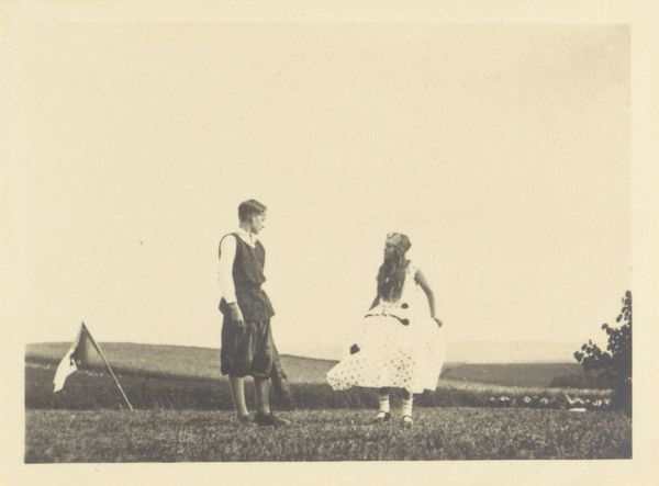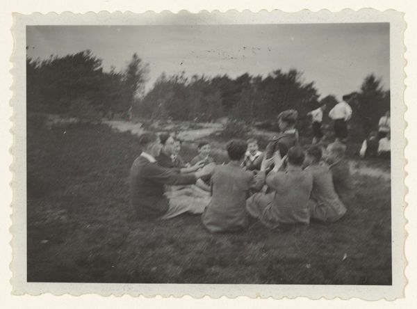Curator: Look at this fascinating gelatin silver print, simply titled "Group Kneeling in Field--J.L.A.", captured by Robert Frank sometime between 1955 and 1956. Editor: It's... quiet. Melancholy, even. All that green, yet the greyscale leeches the life from it. Is something amiss, or is it just me? Curator: There's definitely a stillness. You sense the solemnity, even without knowing the context. Frank, a master of observation, frames this gathering—folks kneeling, heads bowed, out in a vast field. A stark contrast to say, typical images of jubilant postwar life. Editor: Post-war anxieties though, right? The surface of prosperity masked deep social fault lines. This image is unsettlingly devoid of joy. Look at that boy sitting alone in the foreground; his posture screams dejection. It's not just quiet, it feels almost funereal. Curator: It's Frank pulling back the curtain, perhaps. This was taken during his travels across America for *The Americans*, a period marked by his own outsider status, encountering and capturing raw, unfiltered glimpses of American life. I’d argue he makes them almost performers in a play—an unsettling piece about community, conformity, and possibly even despair. Editor: I see a critique of imposed roles and perhaps hidden pain within apparent community. What's particularly striking to me is the way the composition directs your eye— from the individual to the group. The high horizon line almost boxes them in, like specimens under glass. A very detached perspective of supposed cohesion and belonging. Curator: And yet, you wonder about connection. What draws these people together? What compels them to kneel? There is no specific, right interpretation, which I adore. Editor: It asks more questions than it answers, and I guess that is exactly what makes this such a deeply impactful image. Curator: A shadowy, open wound caught in silvery stillness. Very "Robert Frank".