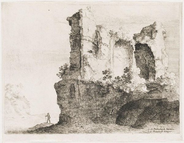 Curator: Dietrich’s "Pyramid and Ruins of Ancient Buildings" depicts precisely that, employing etching to illustrate a bygone era's architectural remnants. My first impression is how this work evokes a sense of melancholic grandeur. Editor: Indeed. The pyramid, although partially ruined, speaks to a powerful past, a civilization wrestling with its own mortality. The repetition of archways suggests enduring human endeavor, even in decay. Curator: I think that Dietrich subtly critiques the socio-political hierarchies inherent within those structures, juxtaposing their faded glory with the everyday lives of those who now inhabit the landscape. Editor: Symbolically, the figures and animals amongst the ruins may represent a return to simpler, perhaps more authentic way of life, free from the burdens of empire. The ruins as a reminder. Curator: Perhaps a space liberated from former social constraints. Editor: An intriguing observation. The visual symbols clearly provide layers for complex interpretations.