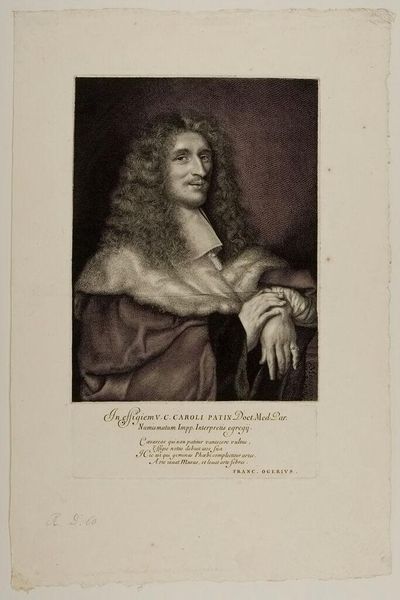 Editor: This is a portrait of Charles Patin, an engraving by Antoine Masson, dating from the late 17th century. There's a formality to the composition, a kind of restrained opulence. How do you interpret this work? Curator: The formality speaks volumes, doesn't it? This wasn't simply about likeness. Consider the socio-political context. The elaborate wig, the fine garments – these are deliberate signifiers of status and power during the Baroque era, but I wonder: who had access to this kind of portrait? How did representations like this shape the perceptions of the ruling class? Editor: I hadn't thought about the distribution aspect. It was probably quite limited. Curator: Exactly. These images helped construct and reinforce a social hierarchy. It begs the question, too: who *wasn't* represented in this way? Whose stories were excluded from these visual narratives? Look at the inscription - likely only accessible to the elite. Who was being addressed in particular, and how does that shape our understanding today? Editor: That's a great point about whose perspective is missing. Seeing the portrait now, it makes me question those power dynamics. Curator: And what of the symbolism? His gesture, that ring... even the way he’s looking directly at us establishes a dynamic of power. To truly unpack the artwork, we also need to delve into philosophy and sociological studies. What sort of intellectual circles did Patin navigate? How might we connect his life with larger events, such as the scientific revolution or burgeoning social unrest? Editor: I appreciate your highlighting the historical and social dimensions. Curator: I hope I helped you consider artworks in the broader contexts of cultural moments and power structures, allowing for enriched discourse and more dynamic readings of history through visuality.