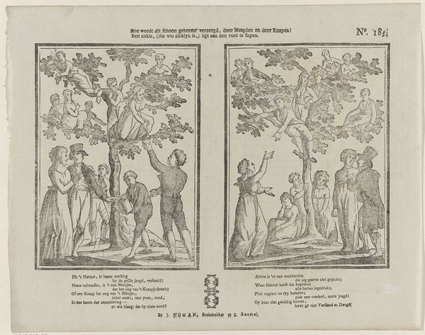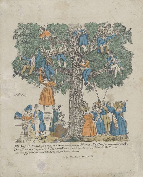 This hand-coloured etching, made in 1743 by Gijsbert de Groot Keur, presents a lively scene of courtship through an allegorical image. The composition is bisected by two trees, laden with fruit, around which figures gather. A muted palette of blues, oranges, and greys gives the print a gentle, dreamlike quality. The print's design employs symmetry to underscore its themes. On either side, figures reach for fruit, symbolizing romantic pursuits. The fruit becomes a signifier for desire, and the act of picking it suggests a negotiation of social and personal expectations. Here, the act of ‘grasping’ after what is ripe reflects the desires of the suitors and the sought-after. De Groot Keur uses the orchard as a semiotic space where natural abundance meets human longing, capturing a playful yet pointed commentary on social interactions and the pursuit of love. Note the careful arrangement of elements, suggesting a structured approach to the chaos of human relations.