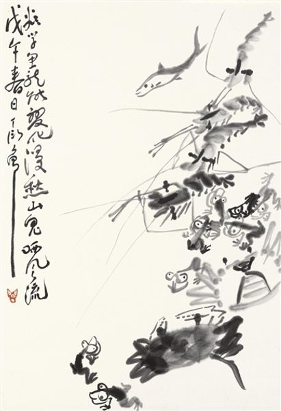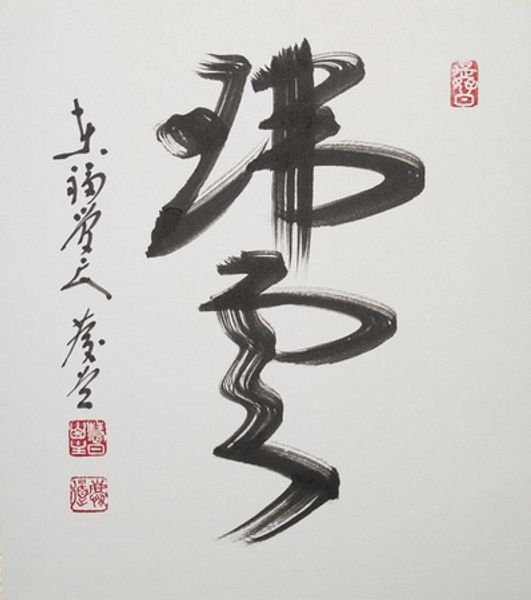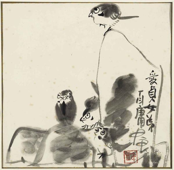 Curator: Alright, let's dive in. This is "Frogs," an ink drawing by Ding Yanyong, created in 1972. What's your first impression? Editor: Stark and quiet. There’s a sparseness that's both elegant and unsettling. Like a haiku—less about what's there, more about what isn't. Curator: I like that. It feels incredibly personal to me; as if Yanyong jotted down this moment for his eyes only. There's so much implied movement in what looks like a simple sketch. You can almost hear the frogs. Editor: The composition certainly contributes to that sense of implied movement. Notice how the artist uses varying brushstrokes to create a dynamic tension between the upper and lower registers, with the calligraphy acting as a visual anchor. The texture too is gorgeous! Curator: True. And the white space around the frogs allows our imagination to fill it in, almost as if the whole marsh appears as we look at it. Makes you consider your place within such a fragile, vital world. What's really there versus what we project onto it, right? Editor: Exactly! That contrast between ink and untouched paper also creates a dialogue. What at first seems minimal reveals itself as incredibly complex. The geometric qualities combined with soft organic brush strokes, showcase the dual nature of observation in its essence, like a meditation, revealing the relationship between structure and free expression. Curator: Precisely, he's doing what good art always does: urging us to linger, reflect, and then see beyond just seeing. Editor: In essence, a masterclass on minimalism and the power of suggestion, leaving us with an echo long after we turn away. Curator: Indeed. Thank you, “Frogs,” and Ding Yanyong, for being more than meets the eye!