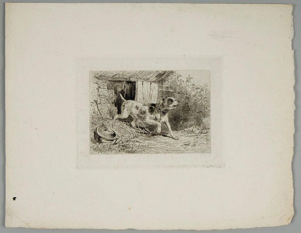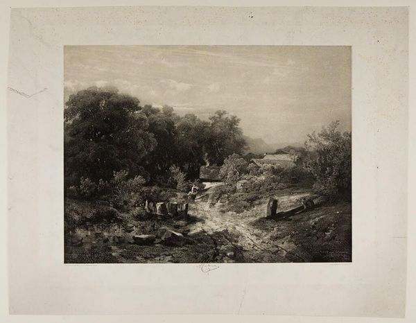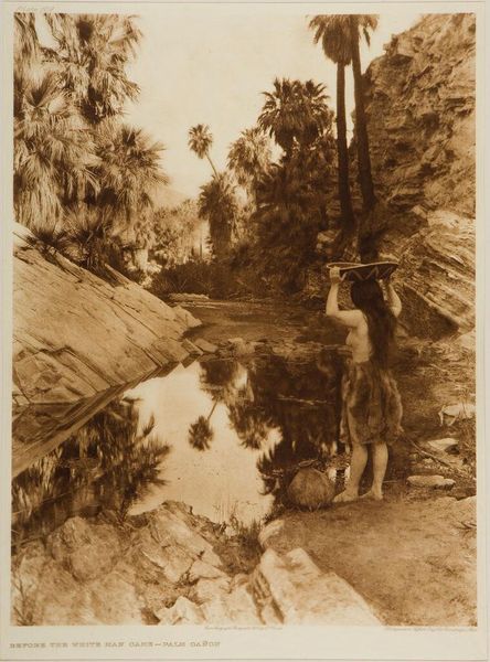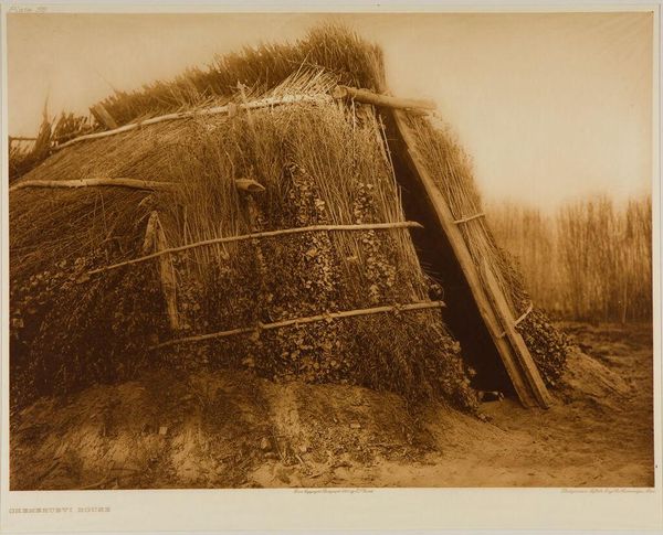 Curator: Edward Sheriff Curtis’s photogravure, “Diegueño House at Campo,” captures a moment of everyday life. The Diegueño people, also known as the Kumeyaay, resided in what is now Southern California and Baja California. What strikes you about it? Editor: The sepia tones and the woman's posture give it a serene, almost timeless quality. She seems deeply connected to the land and her work. Curator: Curtis’s work is complex. While he sought to document Indigenous life, his photographs are often staged and romanticized, fitting into a larger narrative of the "vanishing race." The composition, with the woman in traditional dress, reinforces this. Editor: It’s crucial to acknowledge that Curtis was not simply a neutral observer. His images were shaped by his own cultural biases and the prevailing attitudes of his time, influencing the public’s perception. Curator: Absolutely. Studying it through a critical lens allows us to consider the broader social and political context of the early 20th century. Editor: It serves as a potent reminder to interrogate the power dynamics inherent in representation and historical narratives.