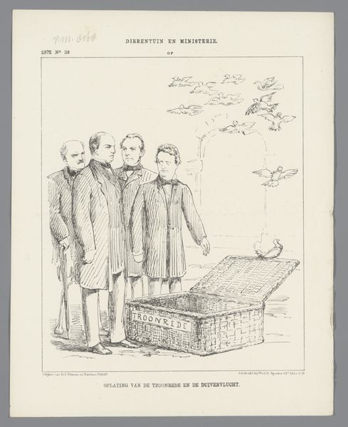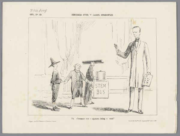 Curator: Welcome. The artwork before us, dating from 1882, is titled "Spotprent op de bezuinigingen," which translates to something like "Cartoon on the Austerity Measures." It’s an etching by Johan Michaël Schmidt Crans, executed in pen on paper. Editor: Immediately, I'm struck by the somber mood. The hunched figures in dark robes look almost like a funeral procession—except, instead of carrying a coffin, they’re lugging suitcases! It’s darkly funny, though I suspect not intended to make anyone laugh too hard. Curator: Indeed. Formally, observe the strong diagonal lines created by the procession of figures leading towards the right. This directional force is then counteracted by the upright figure on the left, creating a visual tension reflective, perhaps, of the conflicting forces within Dutch society at that moment. The repetition of the suitcase shapes also structures the image. Editor: Suitcases emblazoned with names like "Christian Archaeology," "Aesthetics," and "Ancient Dutch Law," no less. The one figure waving goodbye seems almost gleeful! The caption below adds another layer, suggesting these are professors losing funding because of the budget cuts. A little dig at institutional priorities, perhaps? Curator: Precisely. The caricatured style underscores this critique. The elongated noses and exaggerated postures function to ridicule, amplifying the sense of absurdity and injustice felt during periods of austerity. Crans effectively uses semiotic shorthand to comment on a societal ill. Editor: So, it’s not just about money then, but what society chooses to value? That's what I am gathering here. And you know what? The more I look, the more relevant it feels today, in this present political context where funding gets yanked. Funny how history rhymes, isn’t it? Curator: It offers a case study in understanding visual critique, allowing one to view socio-political commentaries during the rise of modernity. I consider that successful art. Editor: Makes you think, doesn’t it? So much packed into such a simple black-and-white print!