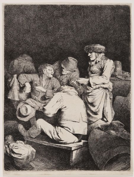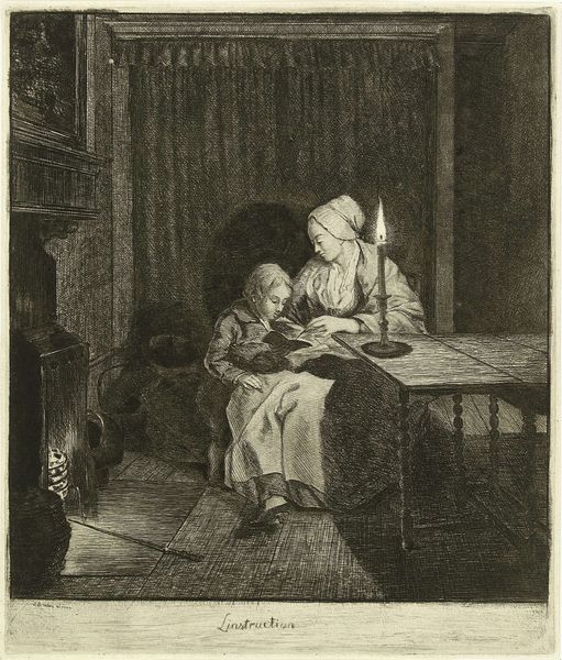 Editor: Here we have Cornelis Bega's "The Young Mother". It's a small etching, and I’m struck by how the indoor scene contrasts with the light-filled world outside the window. What story do you think it's trying to tell? Curator: Bega situates this intimate scene within a broader visual culture that often idealized domesticity, but with a keen eye on social realities. How does the artist portray the mother and child? Does it evoke sentimentality, or something else? Editor: I see a kind of weary tenderness. Not idealized, really. Curator: Exactly. Consider how prints like this circulated. They brought these images of everyday life into homes, shaping perceptions of family and motherhood within a specific socio-economic context. Editor: That gives me a lot to think about. Thanks! Curator: My pleasure. It’s fascinating to see how art both reflects and shapes our understanding of social norms.